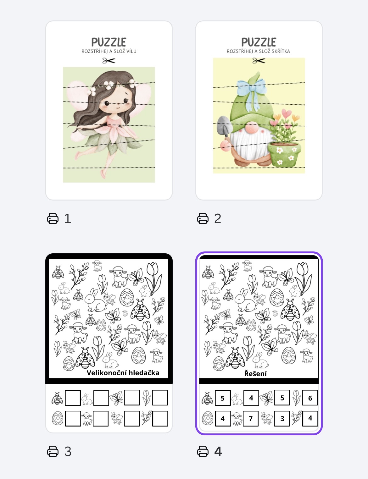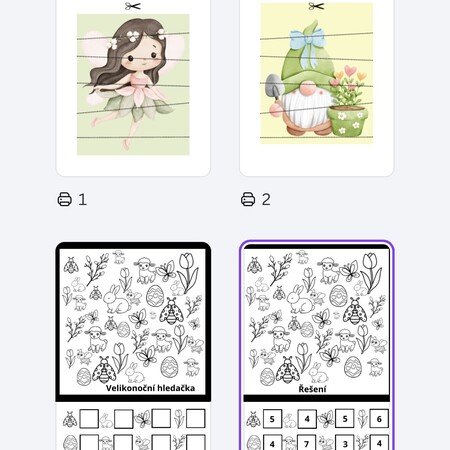 Druhý úkol je najít a spočítat obrázky a zapsat počet do čtverce. Soubor obsahuje také řešení tohoto úkolu. Na konci si jej může dítě vymalovat.