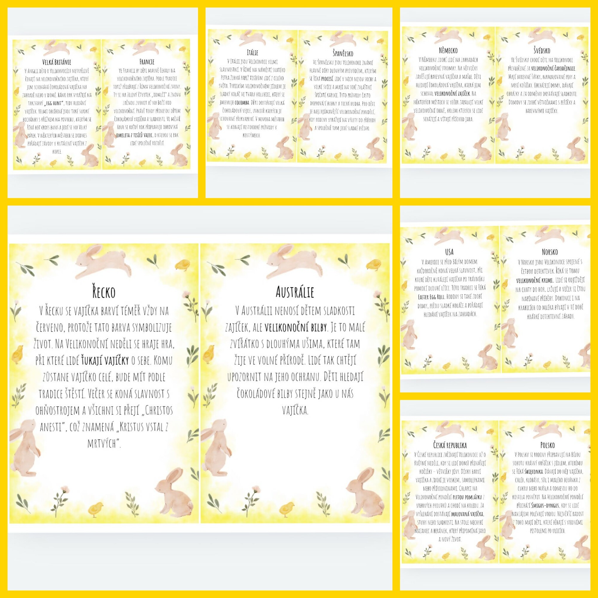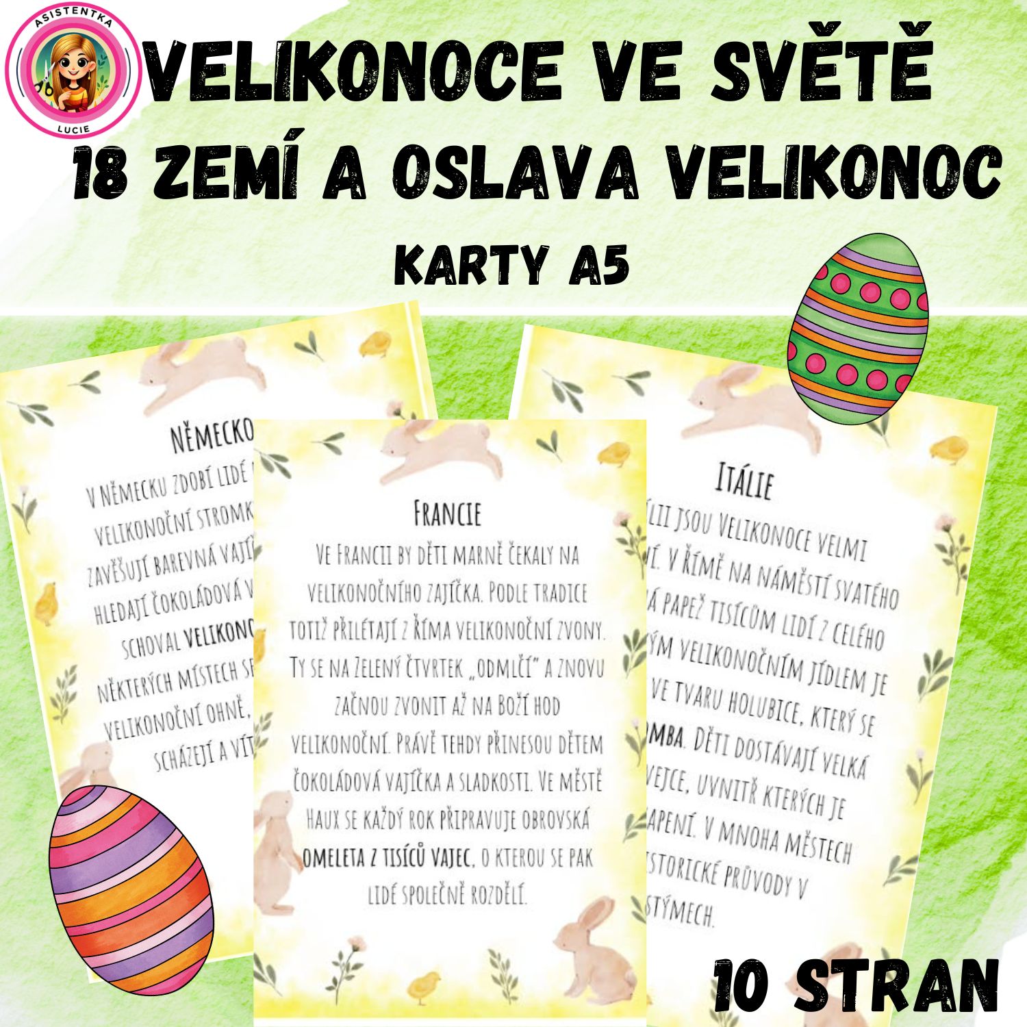 Materiál „Velikonoce ve světě“ seznamuje žáky 1. stupně základní školy s velikonočními tradicemi v různých částech světa. Prostřednictvím krátkých souvislých textů se děti dozvídají, jak se slaví Velikonoce v jednotlivých zemích, čím jsou tyto oslavy typické a v čem se liší od českých zvyků. Texty jsou psány jednoduchým a srozumitelným jazykem přiměřeným věku žáků a vedou děti k porovnávání, hledání rozdílů i společných znaků.