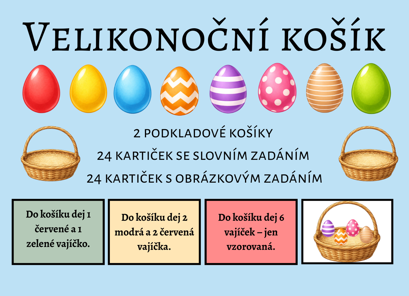 Velikonoční košík je logicko-manipulační aktivita, ve které děti skládají vajíčka do košíku podle slovního nebo obrázkového zadání.