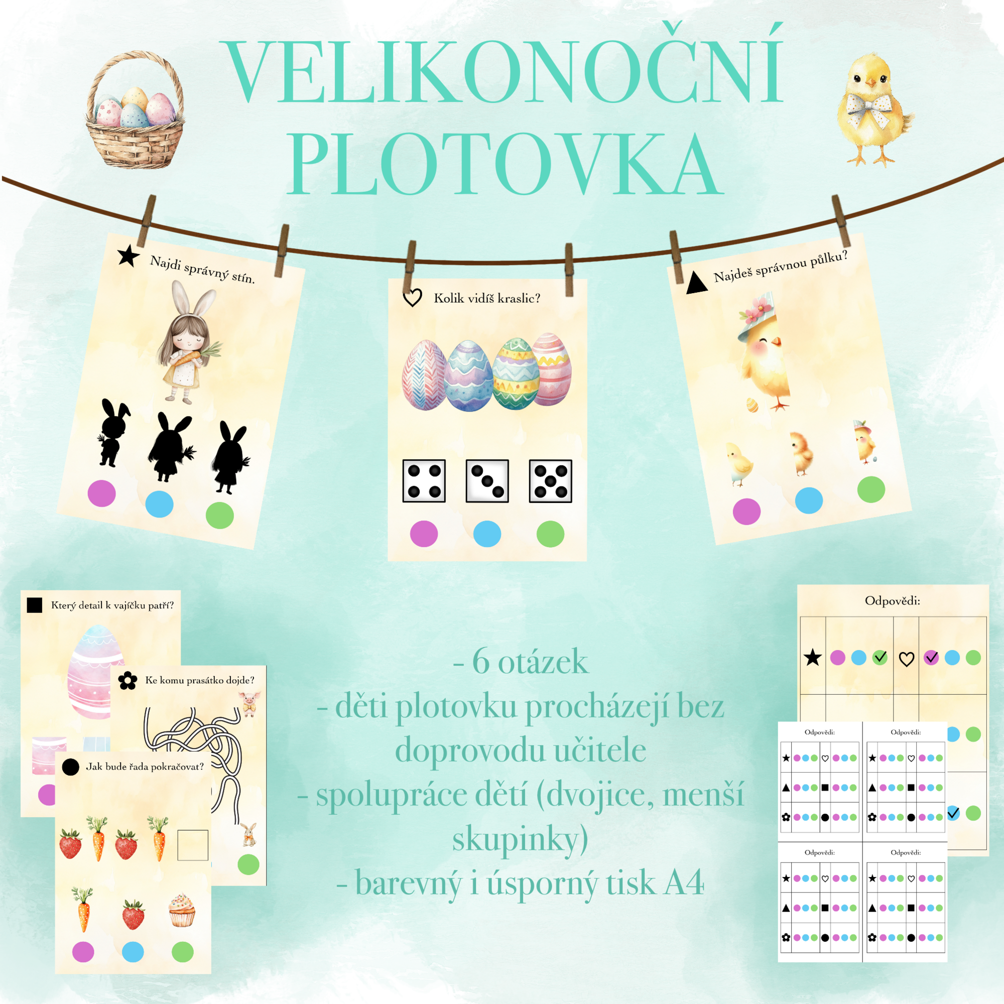 Tento soubor obsahuje velikonoční plotovku. Je připravena k jednostrannému tisku A4. Pro delší životnost je vhodné papíry zalaminovat. Plotovka je k dispozici ve dvou variantách - jedna plně barevná a jedna s úspornějším tiskem.