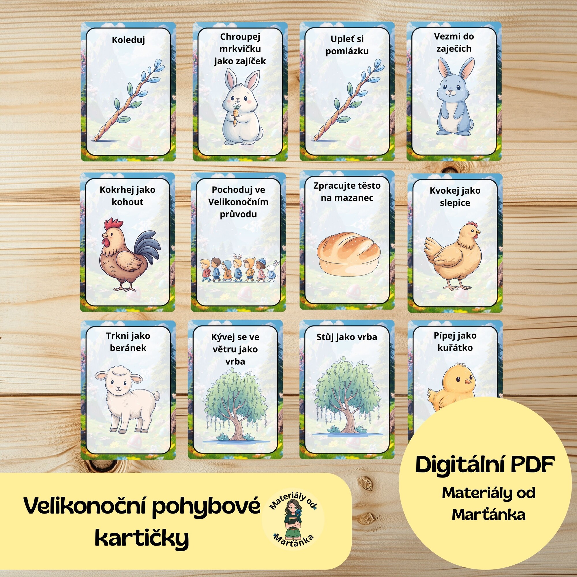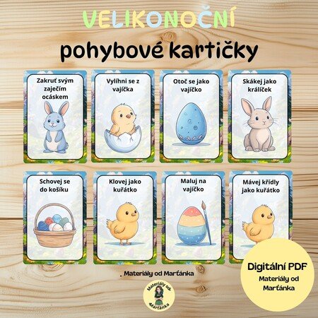Oživte velikonoční období zábavnými pohybovými kartičkami, které zapojí děti do aktivního pohybu hravou formou! Každá kartička obsahuje veselý obrázek a jednoduchý pohyb inspirovaný Velikonocemi – děti se například mohou pohybovat jako kuřátko, skákat jako zajíček nebo létat jako motýlek.