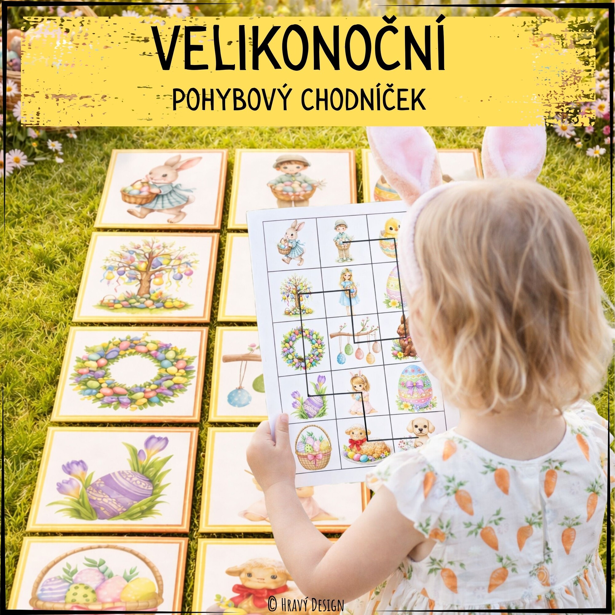 Velikonoční pohybový chodníček je zábavná pohybová aktivita pro děti předškolního věku. Pomocí jednoduché hry děti rozvíjejí prostorovou orientaci, soustředění, logické myšlení a hrubou motoriku.