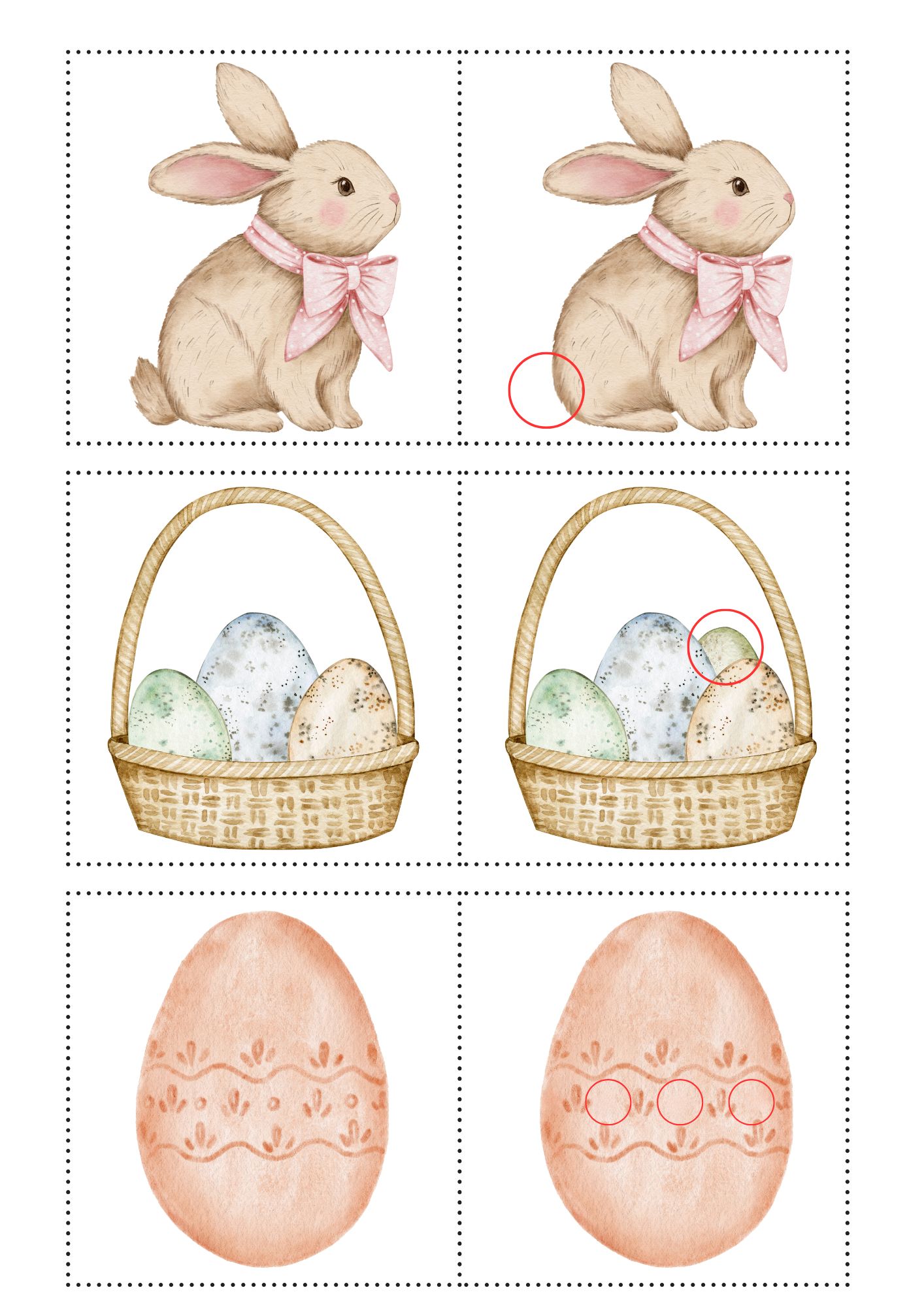 Soubor obsahuje 18 dvojic velikonočních obrázků. Děti mají za úkol najít mezi obrázky rozdíl (něco chybí, něco přibylo, změnila se barva). Soubor obsahuje správné řešení.