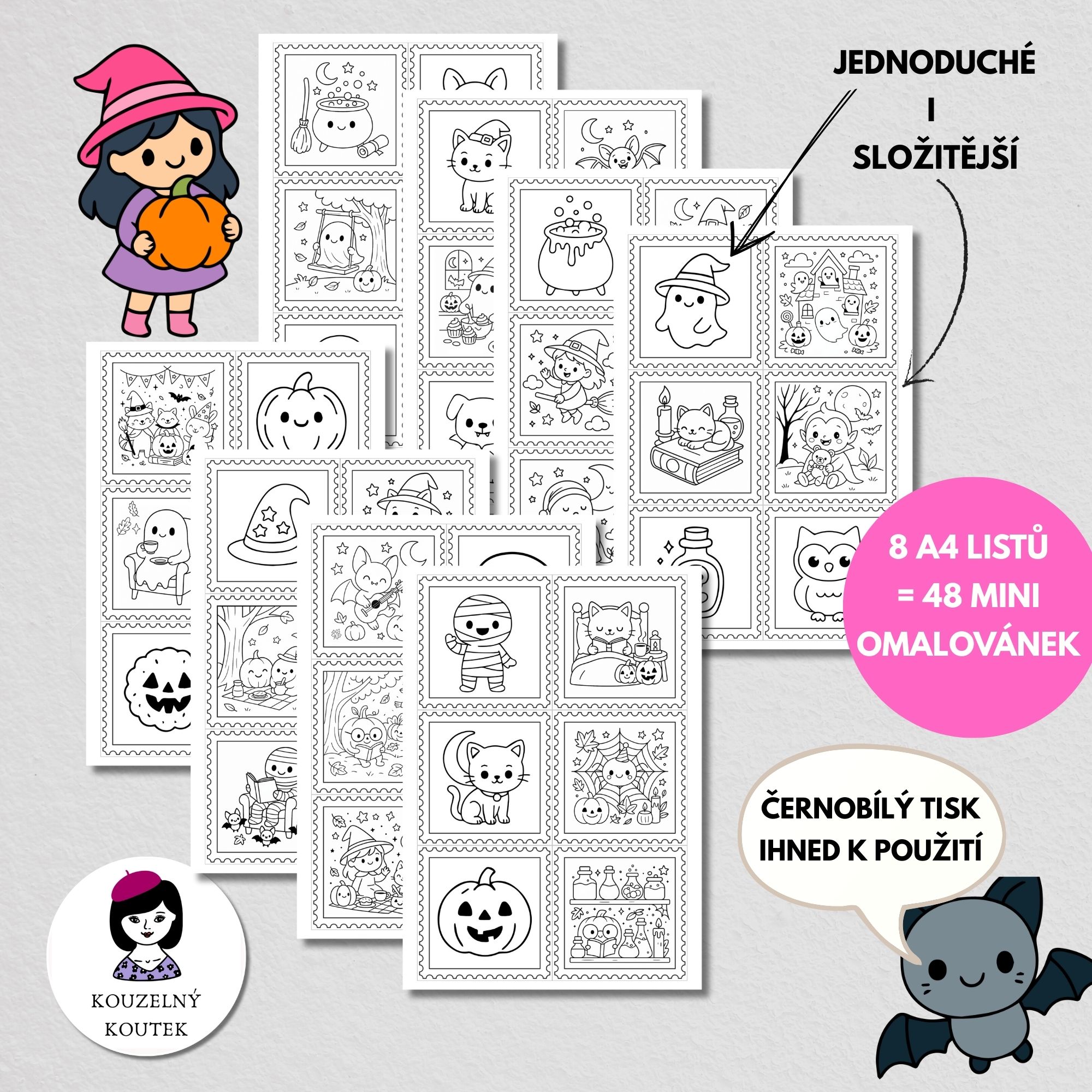 Halloweenské mini omalovánky - 8 A4 stran se 48 mini omalovánkami