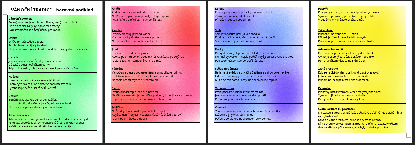 několik kartiček s úkoly pro žáky a poté karty s popisem vybraných tradic