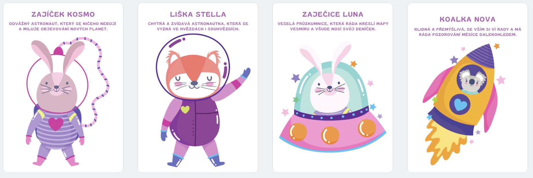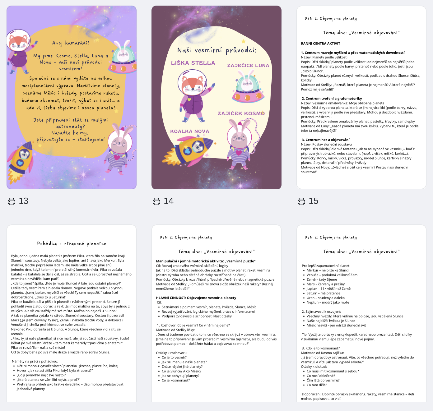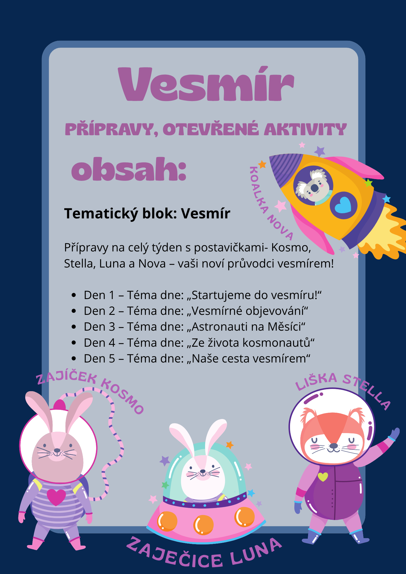 Tematický projekt s postavičkami astronautů: Kosmo, Stella, Luna a Nova – vaši noví průvodci vesmírem! K aktivitám je doplněna vesmírná motivace od zvířátek. (125 str.)