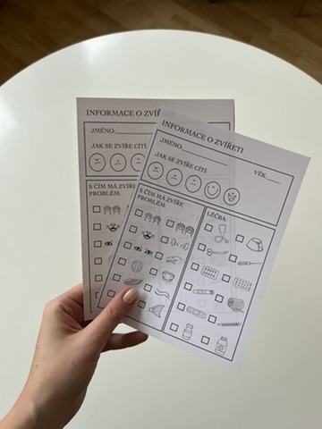- záznam o zvířeti - děti mohou použít při námětové hře, nemusejí umět číst, stačí jim vysvětlit, ať nahoru napíší jméno a věk zvířete (mohou jen čmárat) a pak už jen zaškrtávají podle obrázků, co zvířátko bolí a čím bude léčeno