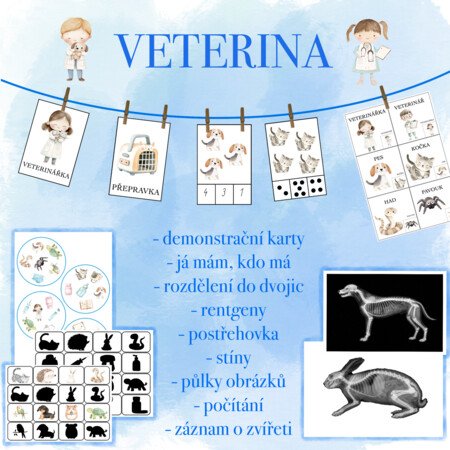 Tento soubor obsahuje demonstrační karty (3 velikosti), záznam o zvířeti, rentgeny (ilustrativní), rozdělení do dvojic, postřehovku, stíny, půlky obrázků, počítání (kolíčkování)