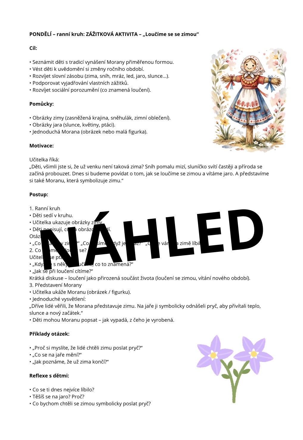 Tento soubor vás provede celým týdnem krok za krokem – od seznámení s tradicí Morany až po radostné vítání jara plné pohybu, tvoření a objevování.