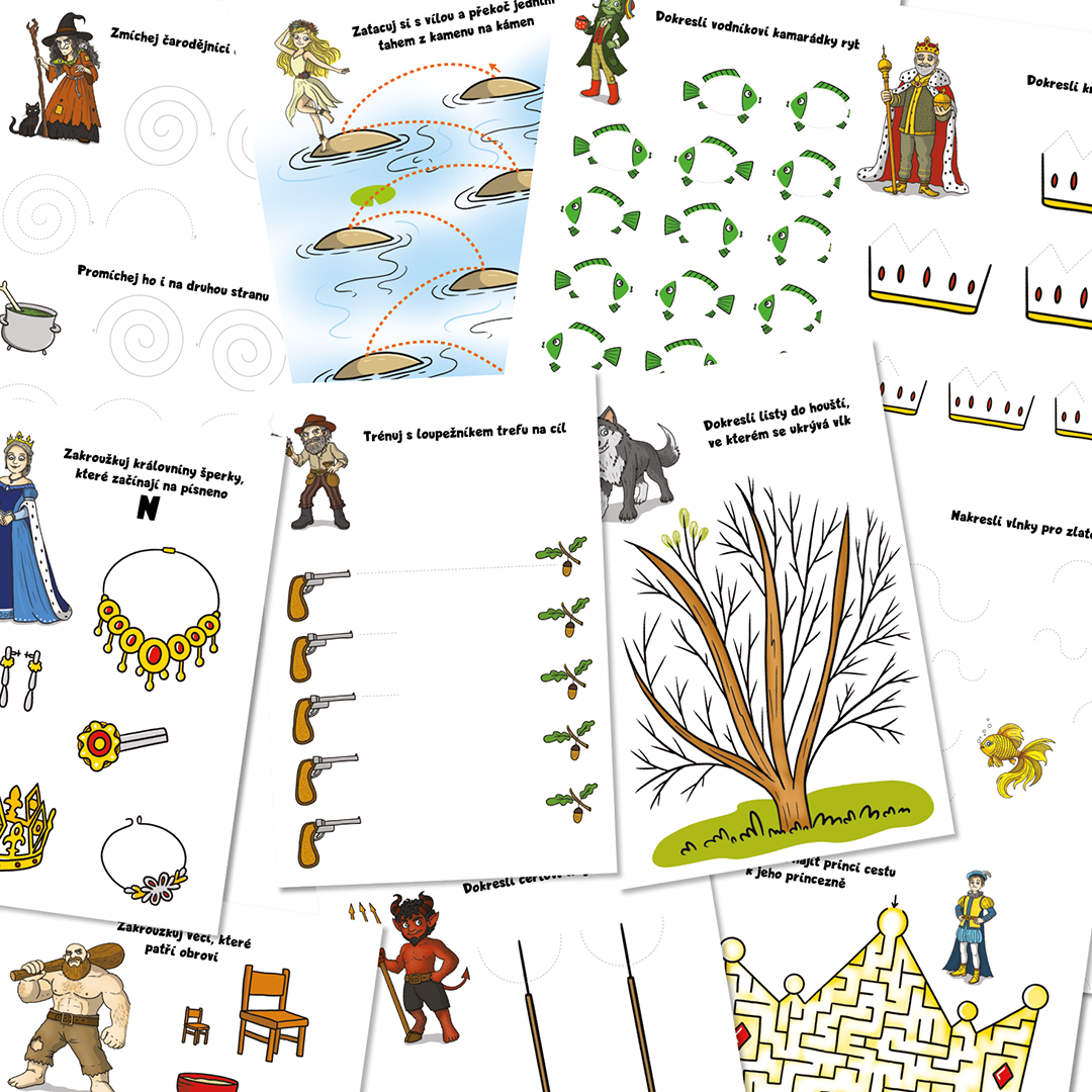 - pracovní listy (počítání, sluchové vnímání, logické uvažování, vybarvování, grafomotorika, zrakové vnímání, bludiště)