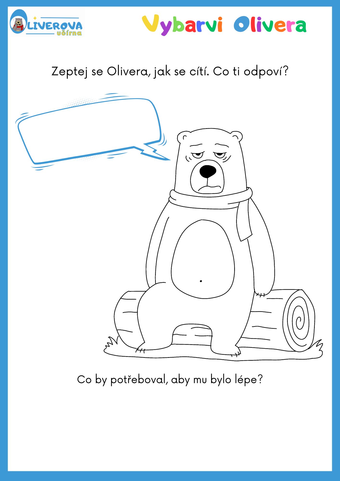 Medvěd Oliver je tu opět s dalšími nápady! Tentokrát si ho můžou děti vybarvit a něco se dozvědět o emocích. Omalovánky rozvíjejí kreativitu, a v tomto případě můžou cíleně pomáhat s rozvojem chápání emocí.