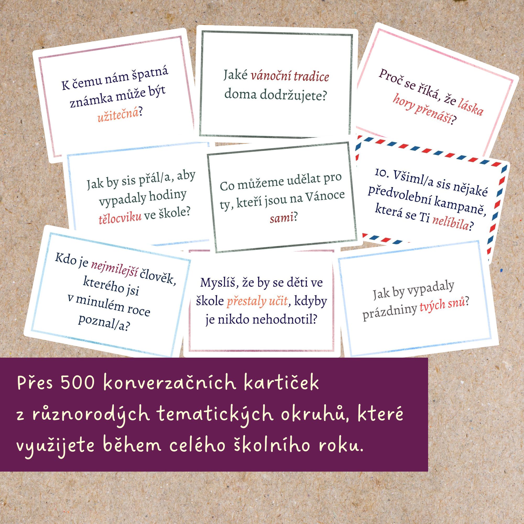Konverzační kartičky fungují jako univerzální učební pomůcka a jsou využitelné pro děti přibližně od 3. třídy. Charakter a hloubku společné diskuze snadno přizpůsobíte věku účastníků.