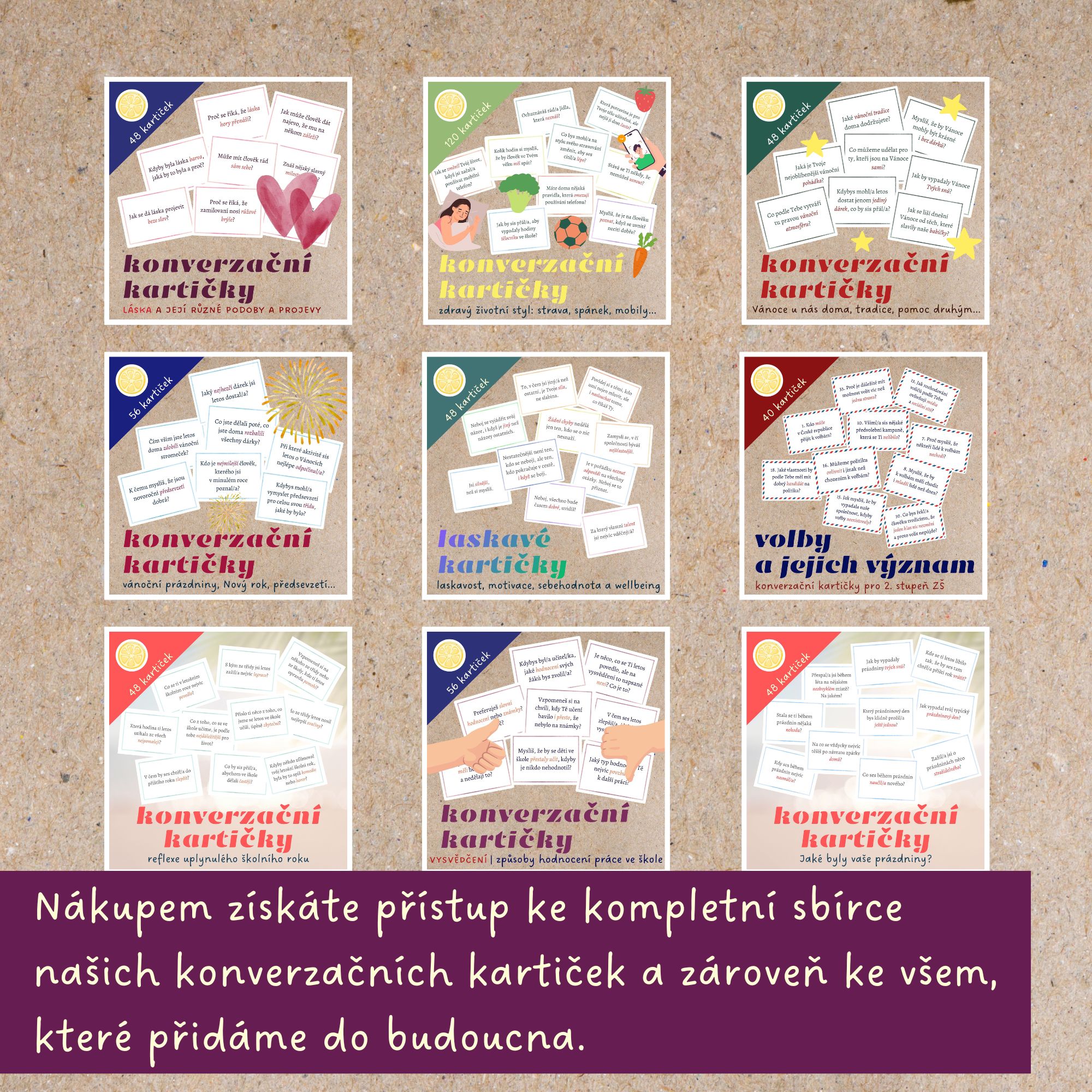 Nákupem tohoto balíčku získáte přístup ke všem souborům konverzačních kartiček, které dosud na našem profilu vznikly. V tuto chvíli sbírka čítá: