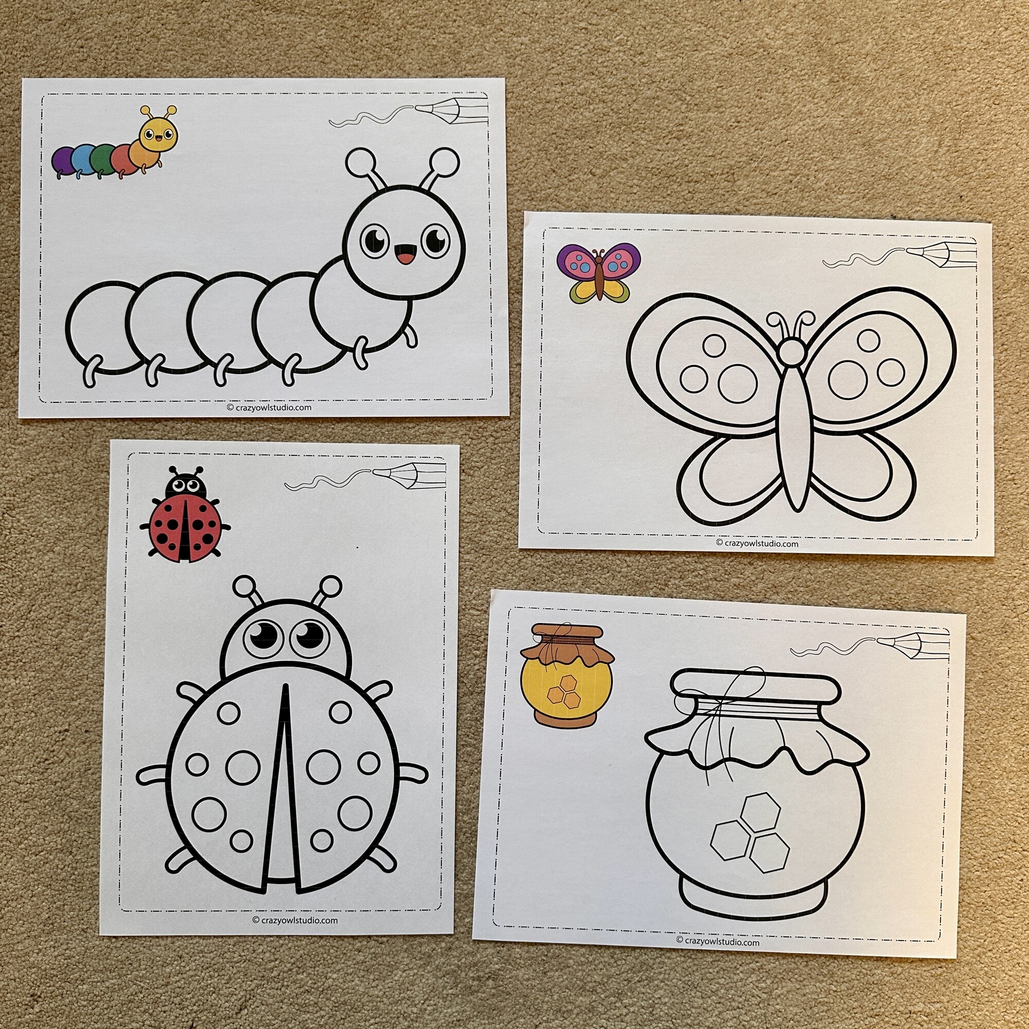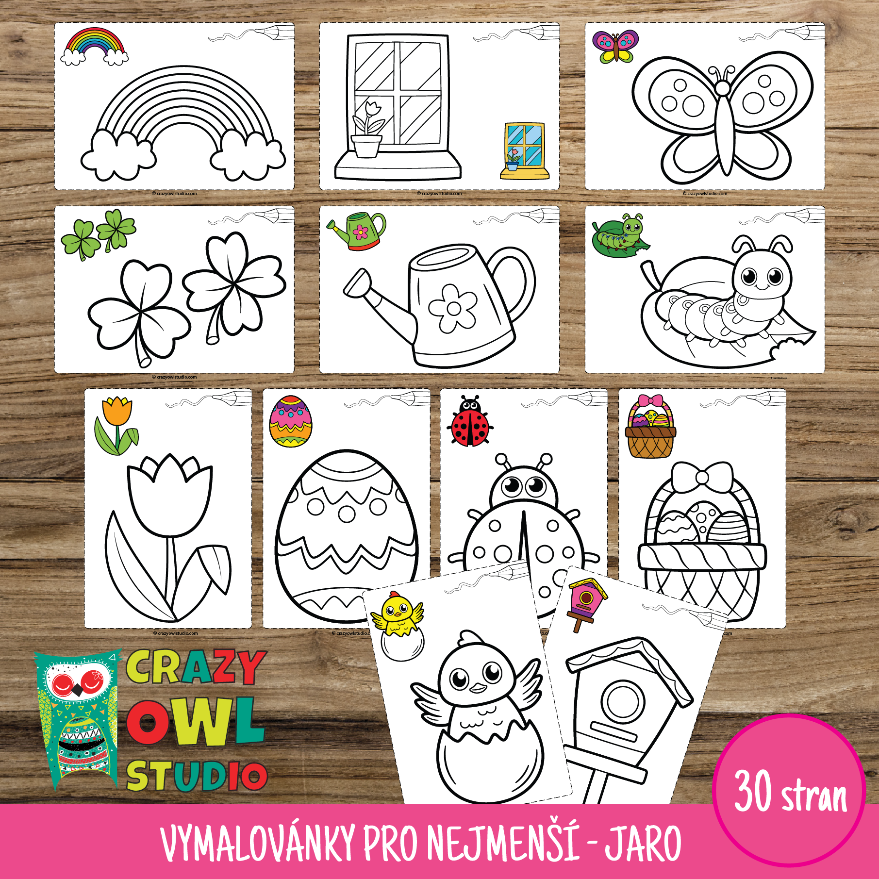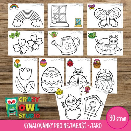 Obsahuje obrázky – tulipán, kraslice, větrník, beruška, košík, kuřátko, deštník, jarní strom, ptačí budka, úl, duha, stonožka, zajíček, motýl, med, čtyřlístek, žižala, konev, déšť, žabka, šnek, housenka