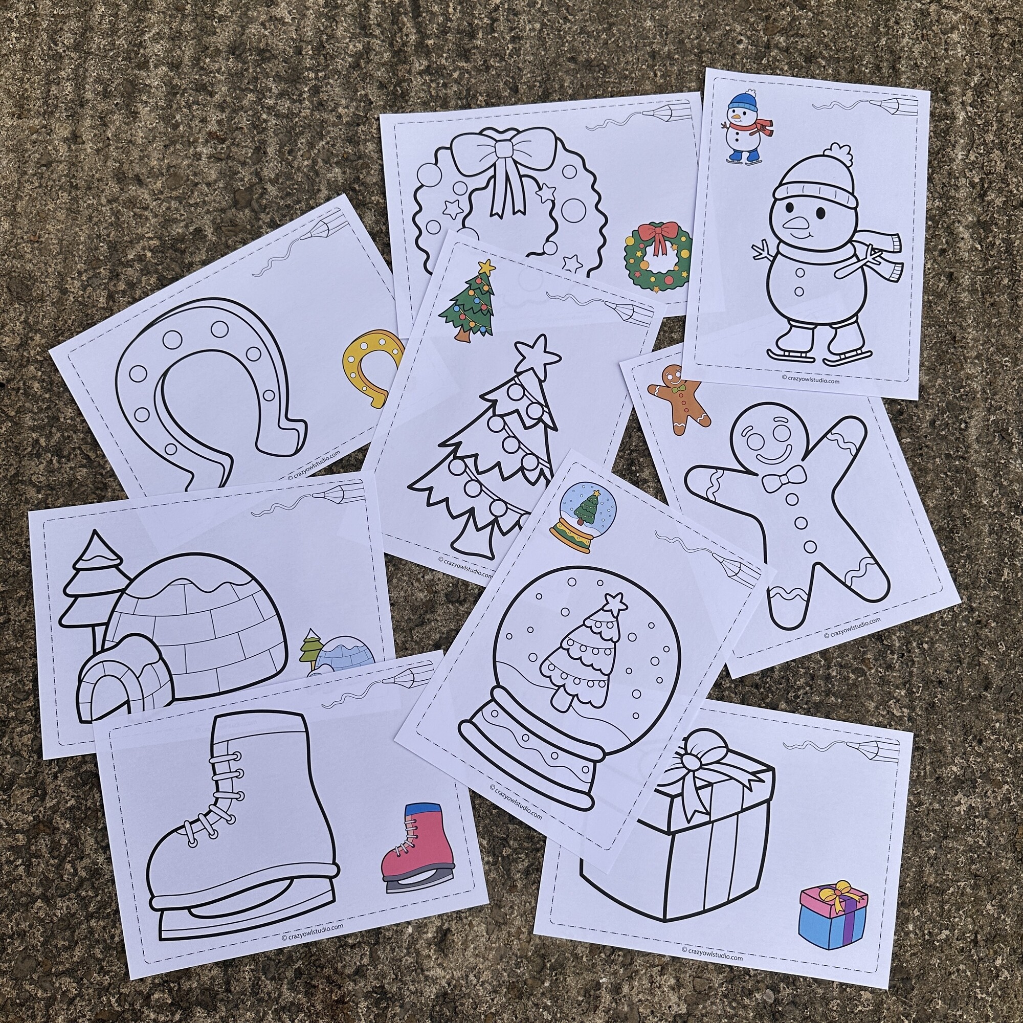 Obsahuje obrázky – podkova, věnec, stromeček, zvoneček, ozdoba, dárek, perníček, svíčky, mašle, pytel dárků, punčocha, krb, sněžítko, ohňostroj, koruna, lucerna, svícen, sněhulák, tučňák, mrož, iglú, led, šála, čepice, čaj, brusle, valentýnka