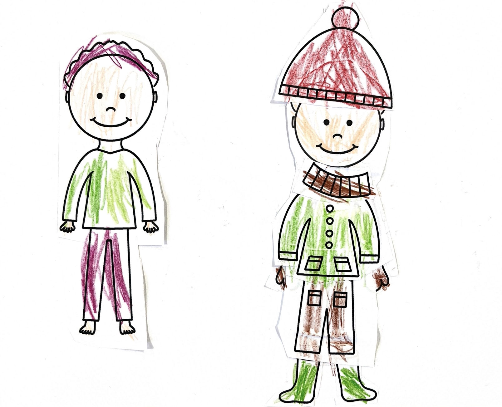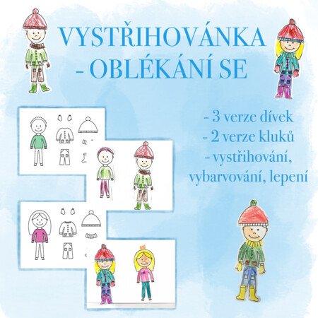 Tento soubor obsahuje zimní vystřihovánku. Najdete zde pdf soubor, kde jsou obrázky kluků a dívek s oblečením, které si děti vystřihnou, nalepí a vybarví. Aktivitu lze využít při ranních činnostech nebo je zařadit kdykoliv během dne.