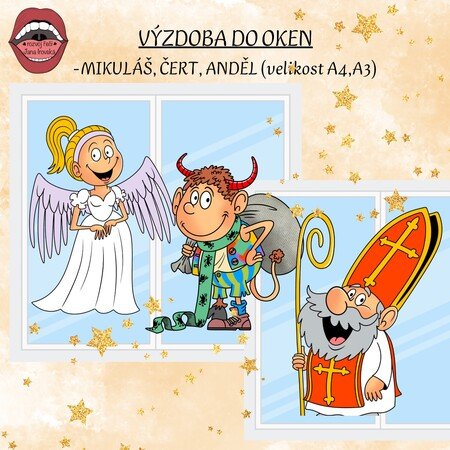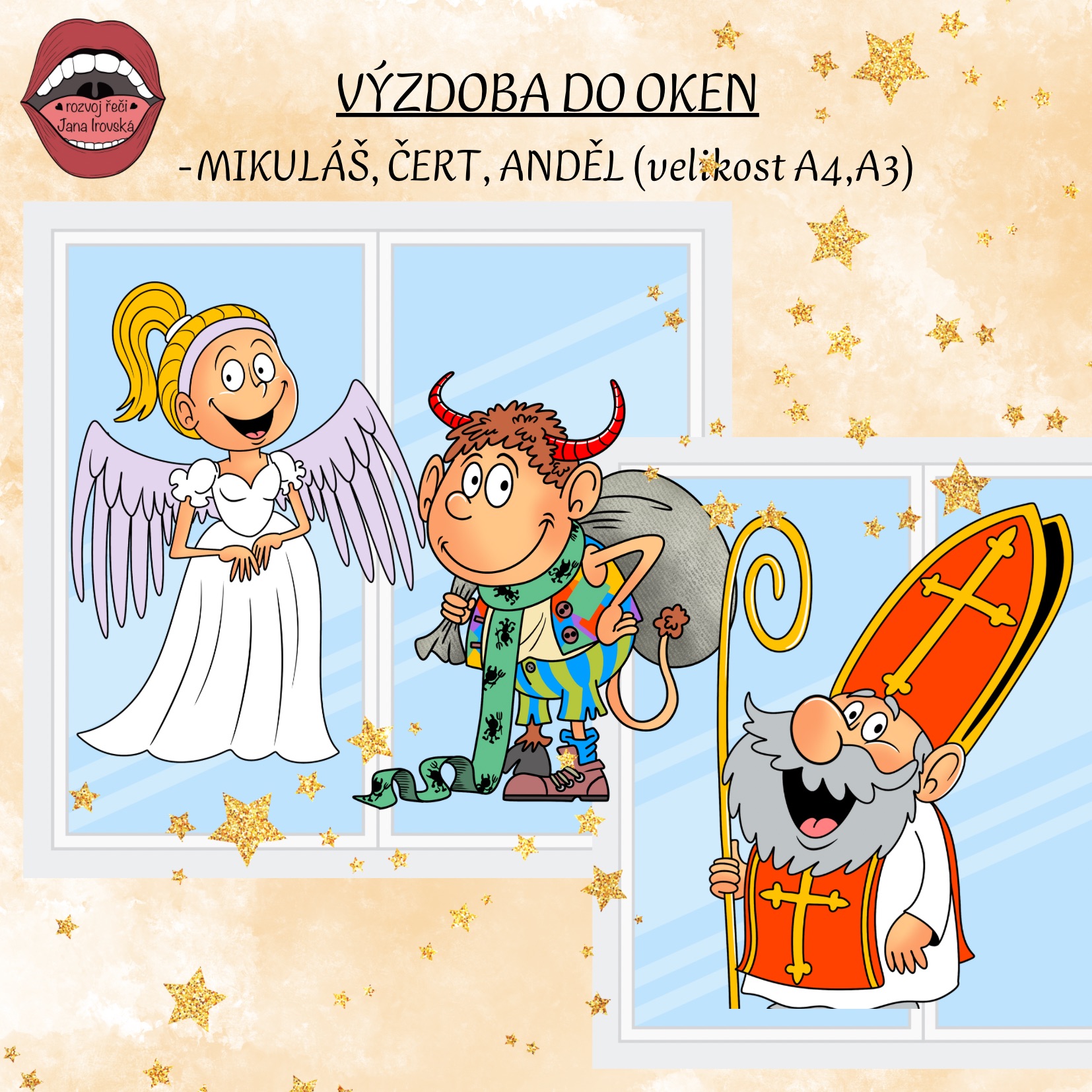 Soubor obsahuje výzdobu do oken s MIKULÁŠEM, ČERTEM A ANDĚLEM velikost A4, A3.
