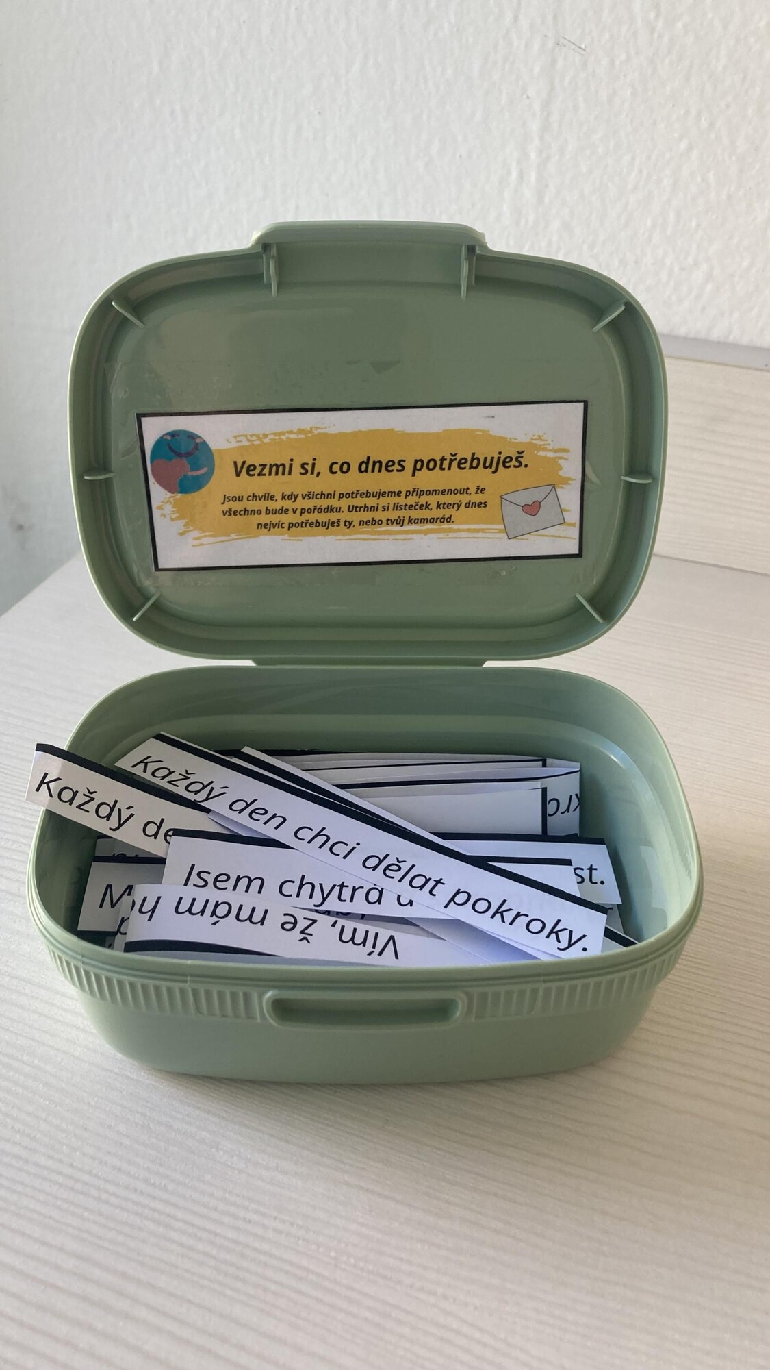 - Lístečky do krabičky – stejné typy vzkazů připravené jako kartičky, které mohou být ve třídní „krabičce povzbuzení“.