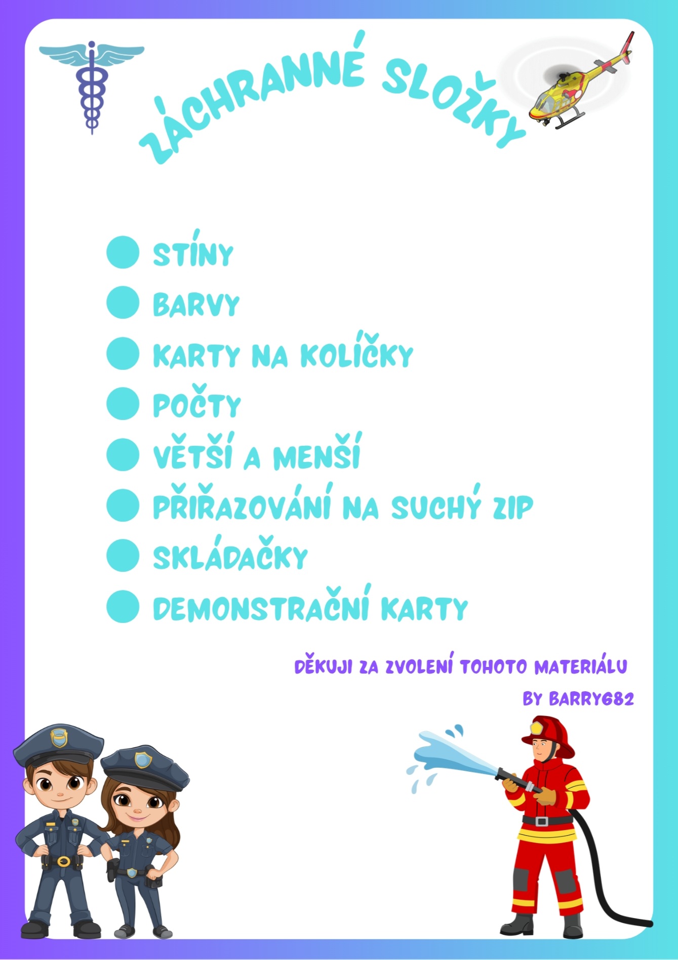 Soubor obsahuje přiřazování stínů, barev a předmětů k danému povolání. Aktivity za využití suchého zipu jako je doplnění chybějícíchybějícího dílku obrázku a přiřazování obrázků na stín. Kolíčkování kde děti hledají určený obrázek a počty za využití obrázků ruky. Skládačky tematitématických obrázků a demonstrační karty.