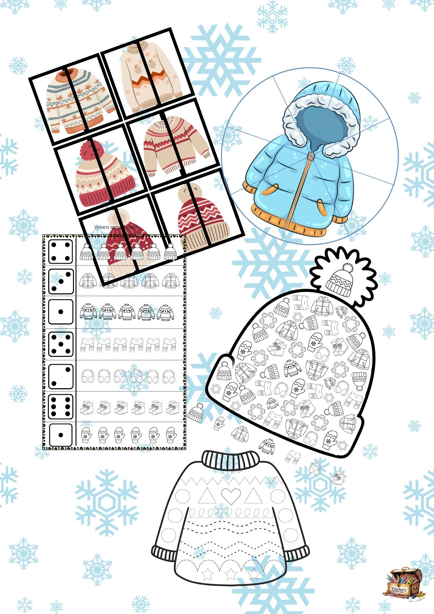 Tento vzdělávací materiál s tématem zimního oblečení nabízí dětem pestrou škálu aktivit, které podporují učení hrou. Barevné i černobílé obrázky a různorodé úkoly motivují děti k práci, rozvíjejí jejich dovednosti a zároveň přirozeně upevňují znalosti spojené se zimním obdobím a vhodným oblékáním.