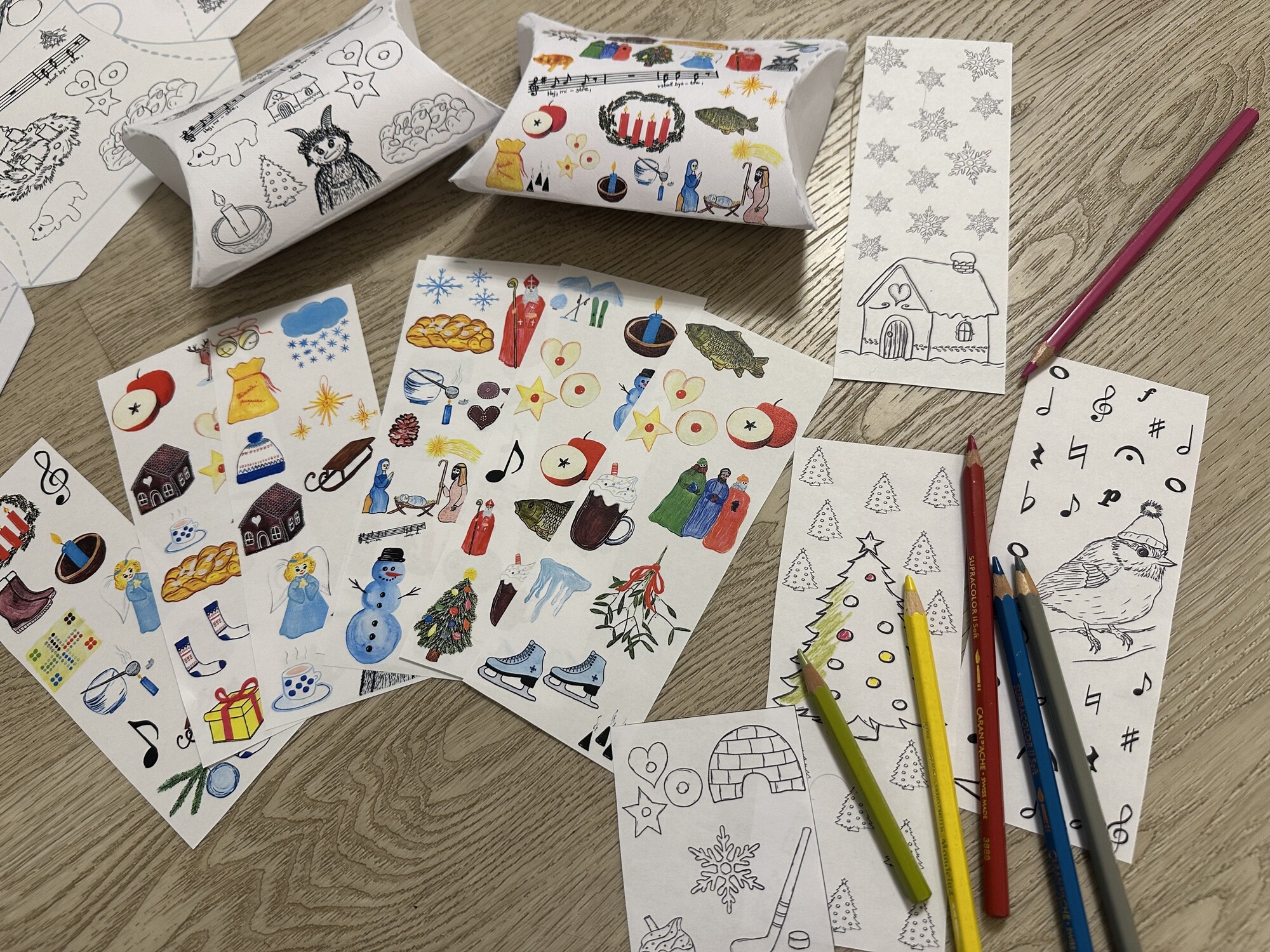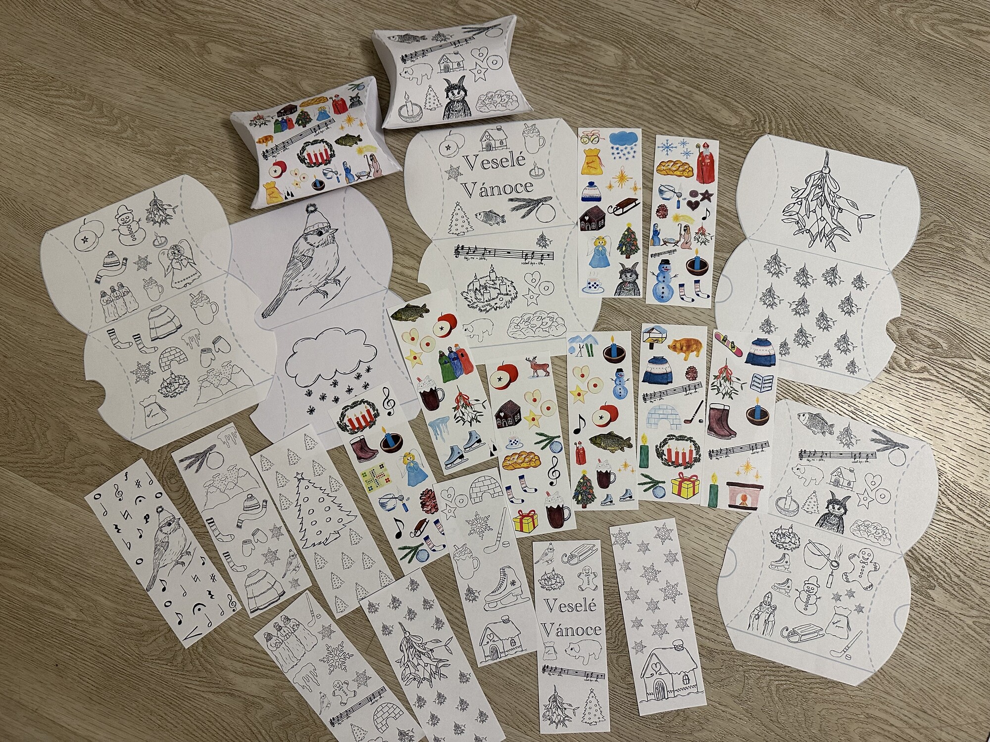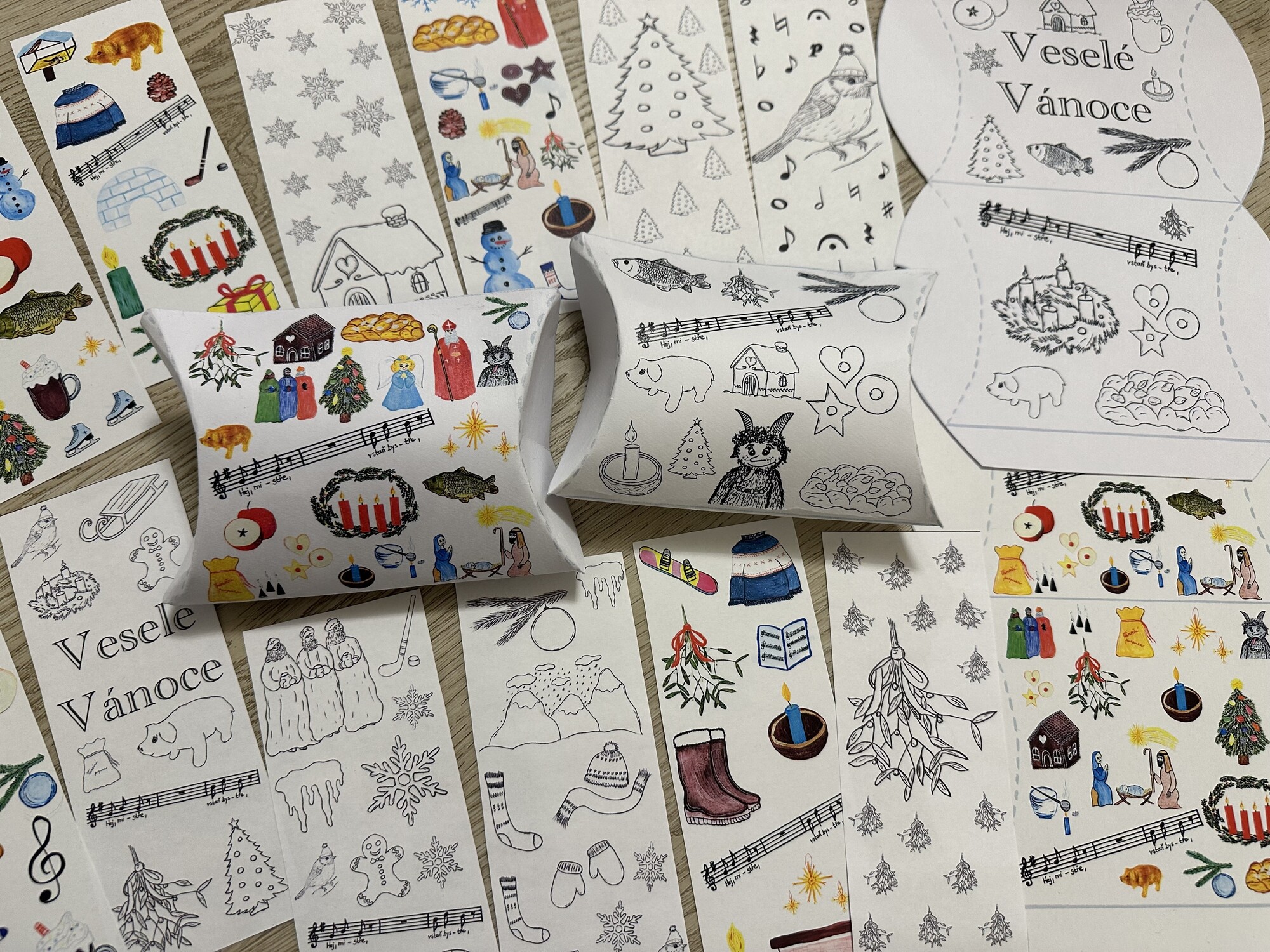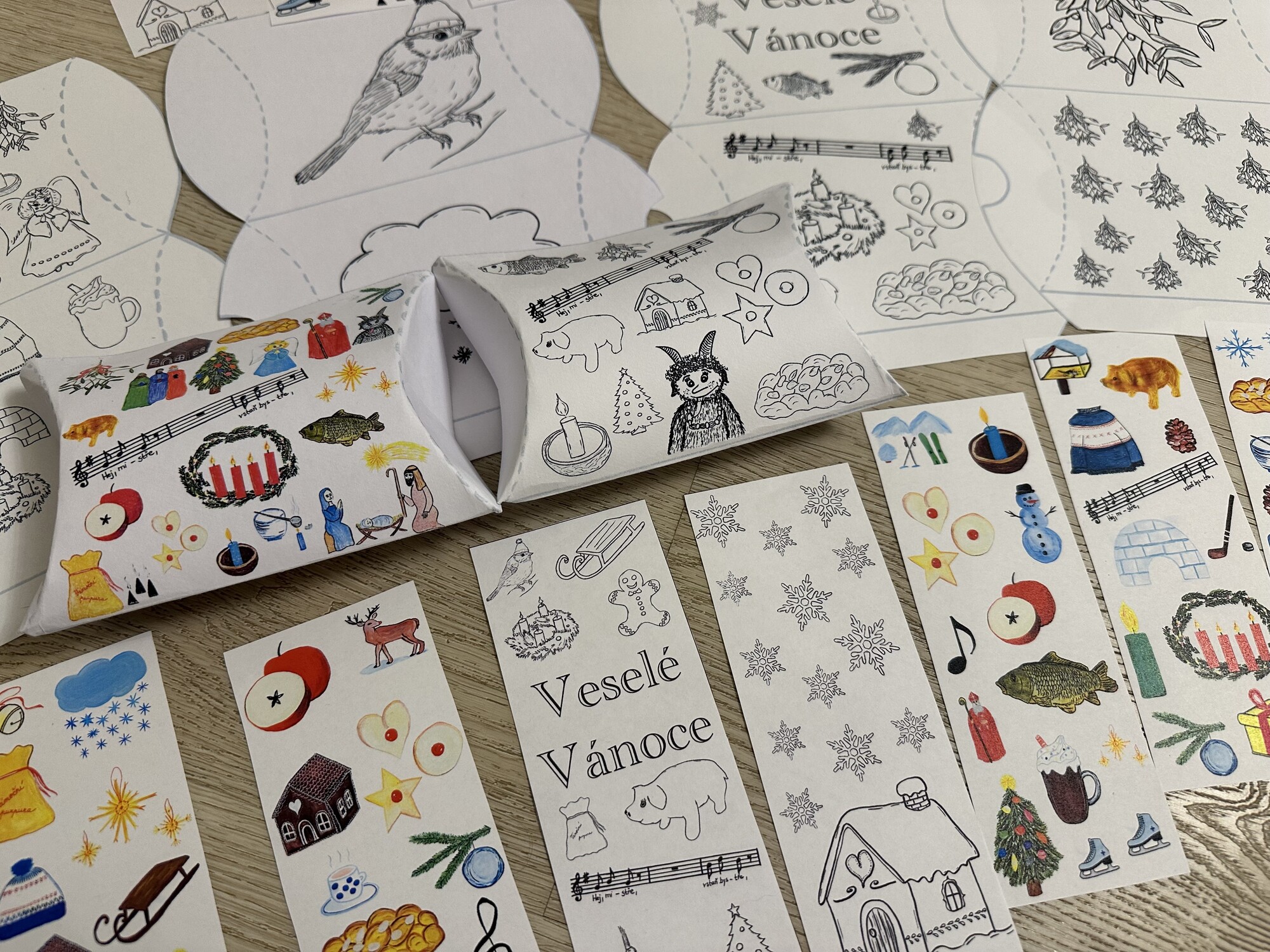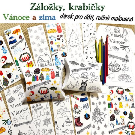 Záložky můžete využít jako dárek pro děti a zvolit barevnou nebo černobílou variantu. Černobílá varianta je vhodná k vybarvení nebo k tisku na barevné papíry. Krabičky jsou určeny k zabalení drobných dárků pro děti, kolegy, k vymalování a k dotvoření.