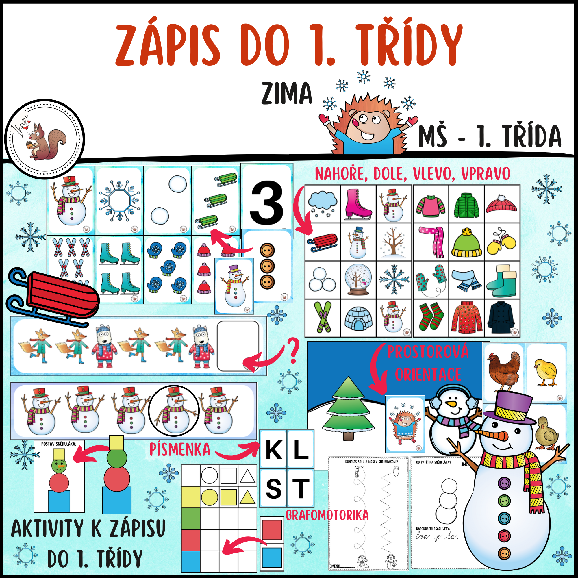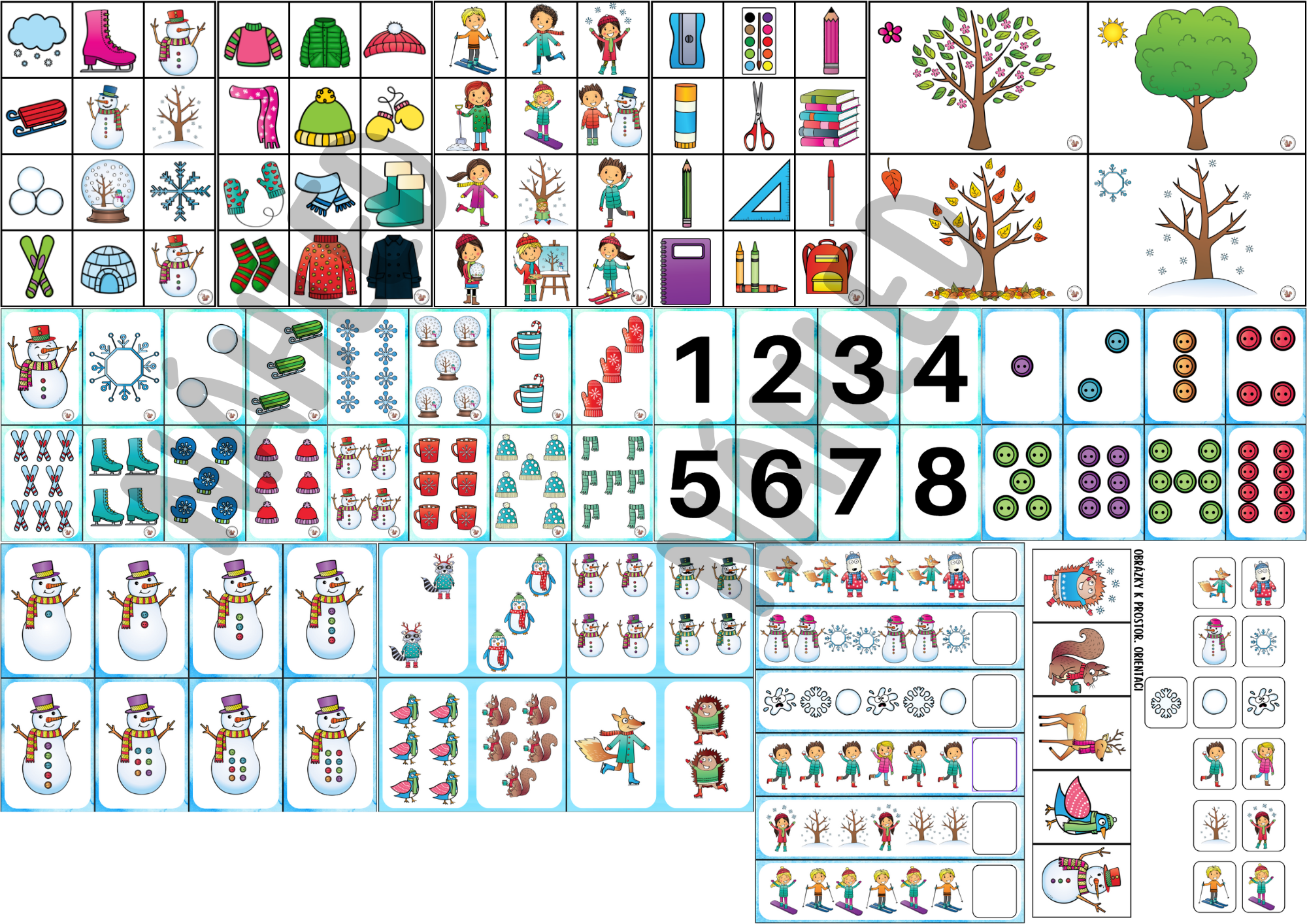 A5 karty s obrázky se zimní tematikou / tematikou školních potřeb využijte pro orientaci v řádku, sloupcích, využijte pojmy hned před, za, vedle, pod, nad, vpravo, vlevo. Vybírejte vhodná slova pro výslovnost - např. svetr, ořezávátko, brusle, šála, atd. Jedna sada obrázků obsahuje zimní aktivity, tedy děti popisují, co děti na obrázku dělají. U všech karet s obrázky můžete ověřit znalost barev.
