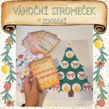 POSTUP: DÍTĚ OBDRŽÍ PODKLAD VÁNOČNÍHO STROMEČKU. NÁSLEDNĚ SI VYBERE/OBDRŽÍ KARTIČKU S POSTUPEM KE ZDOBENÍ. DLE NÁVODU ZDOBÍ STROMEČEK S ODPOVÍDAJÍCÍMI OZDOBAMI V POŽADOVANÉM POČTU. KDE UMISTÍ DANOU OZDOBU JE ČISTĚ NA NĚM.
