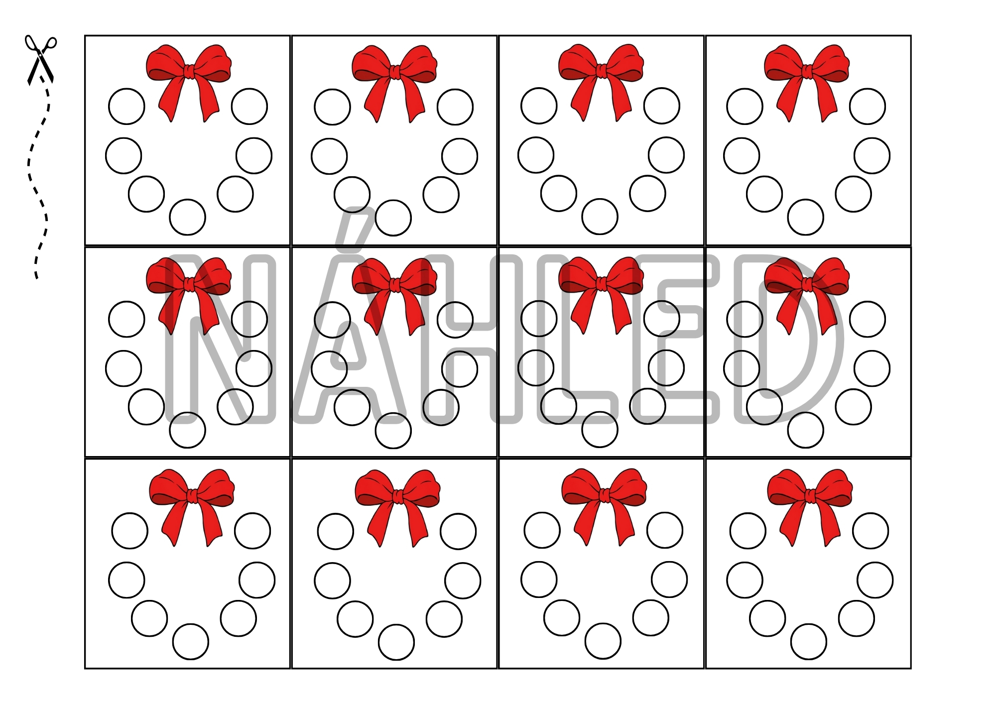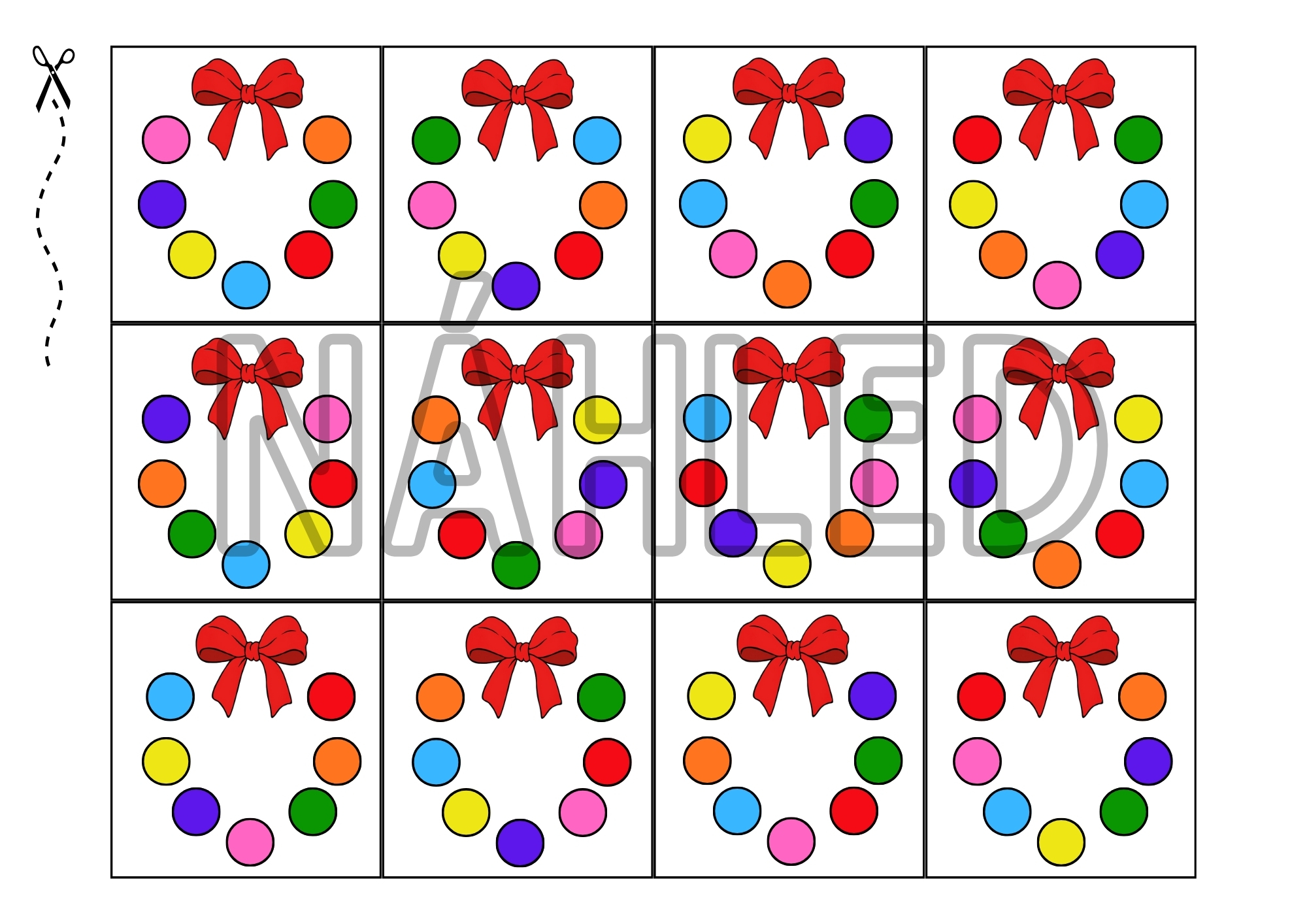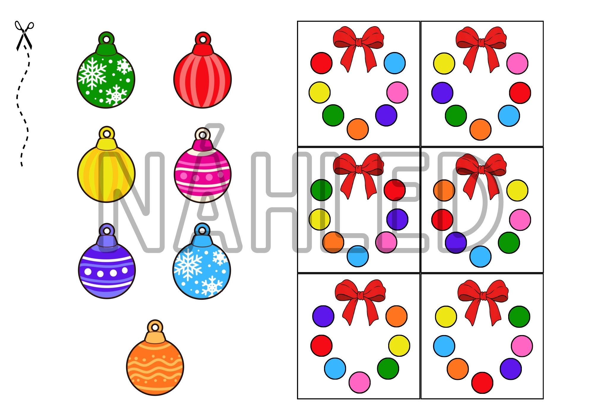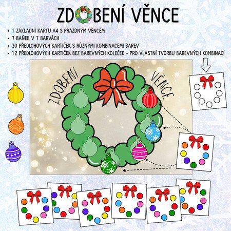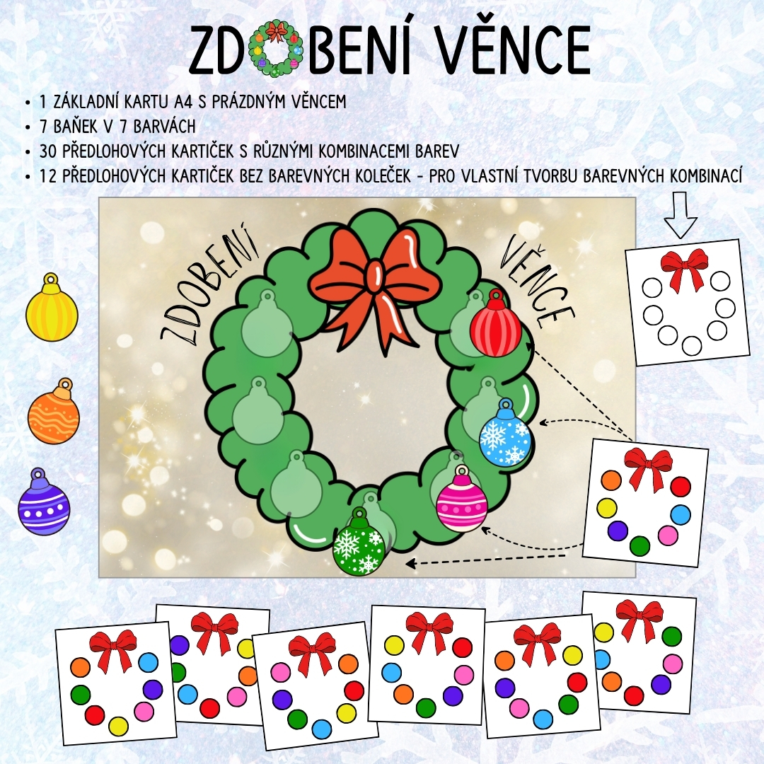 Dítě vybírá správné barvy a skládá baňky na věnec podle barevného vzoru. Vhodné pro individuální práci, ranní činnosti i práci v centrech. Doporučuji laminovat a přidat suché zipy.