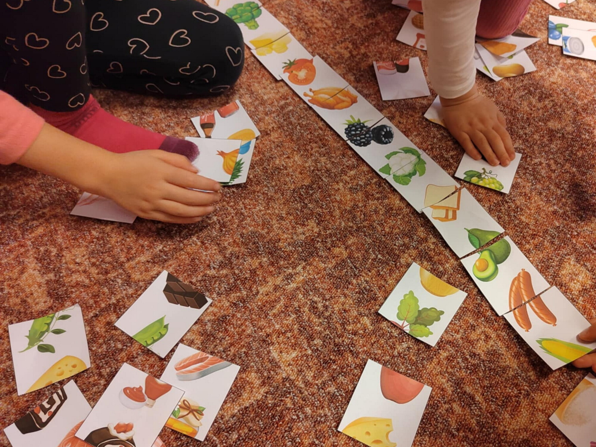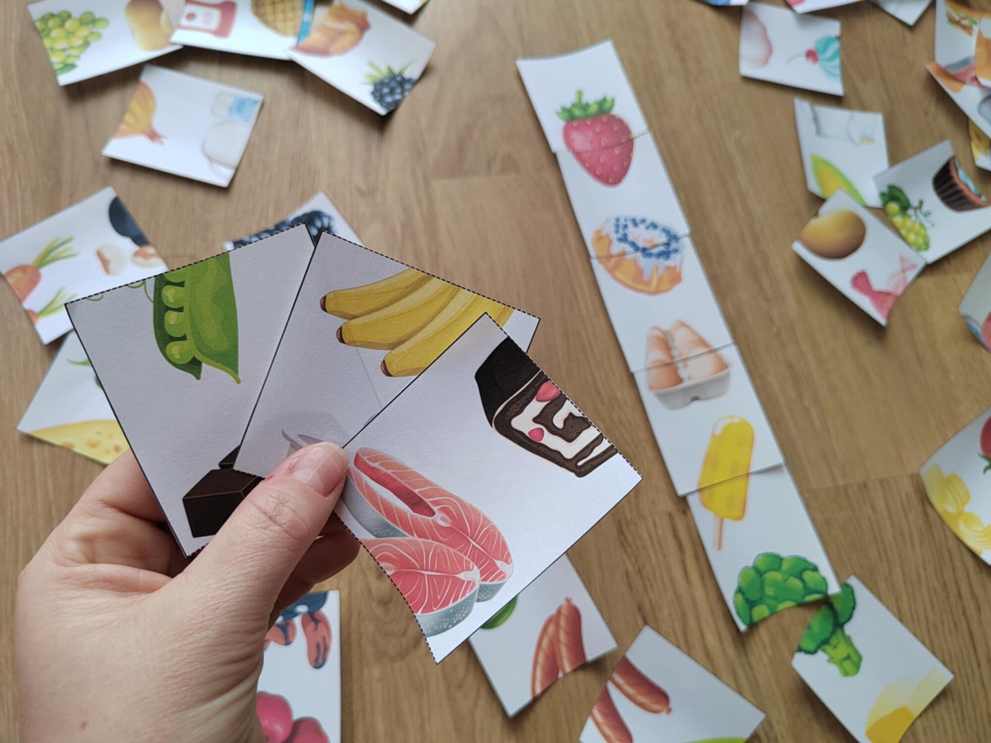 - skládačku se zdravými a nezdravými potravinami (48 kartiček ve velikosti 6,2 x 6,7 cm).