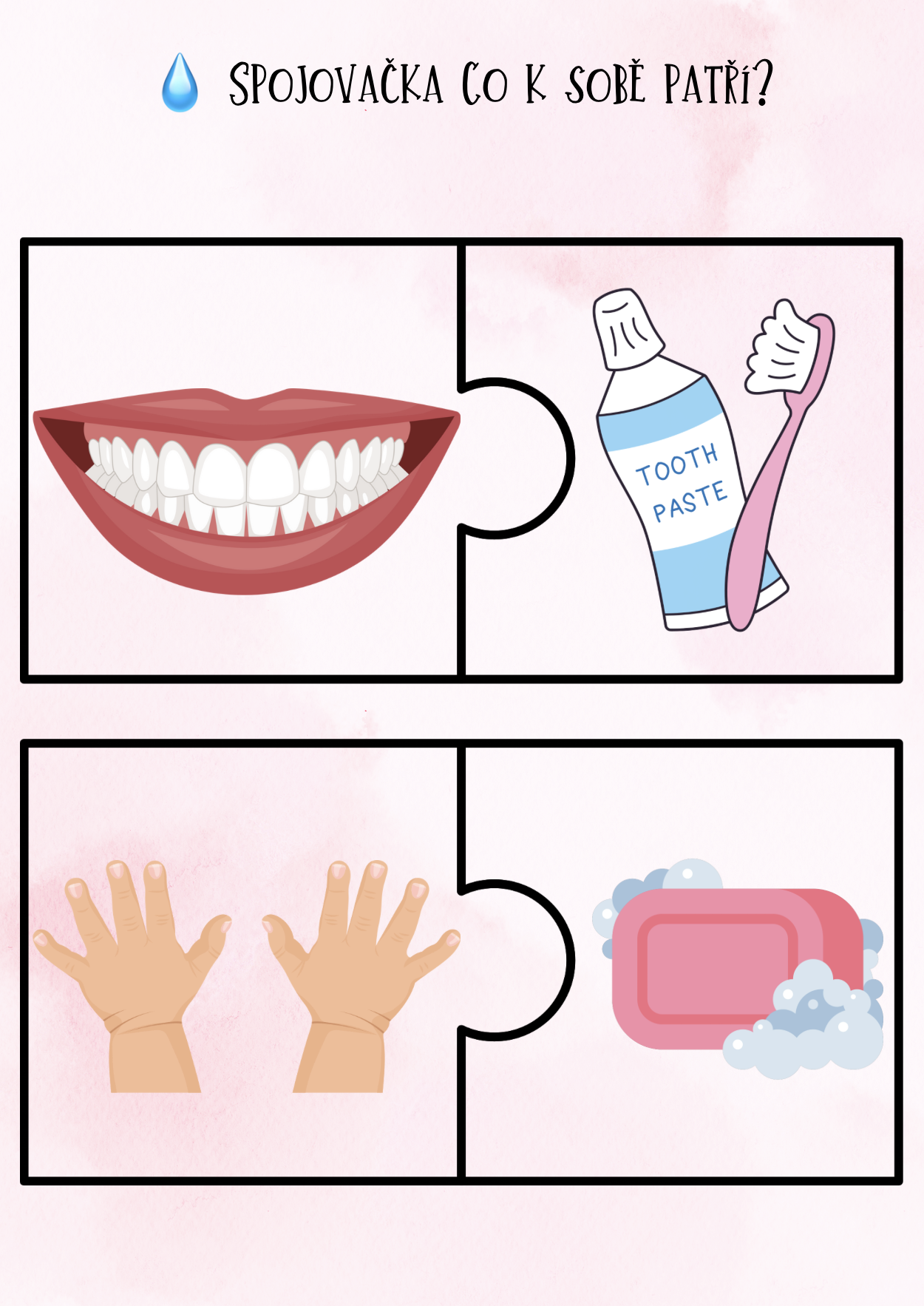 💧 Spojovačka – co k sobě patří (např. zuby – kartáček, ruce – mýdlo)