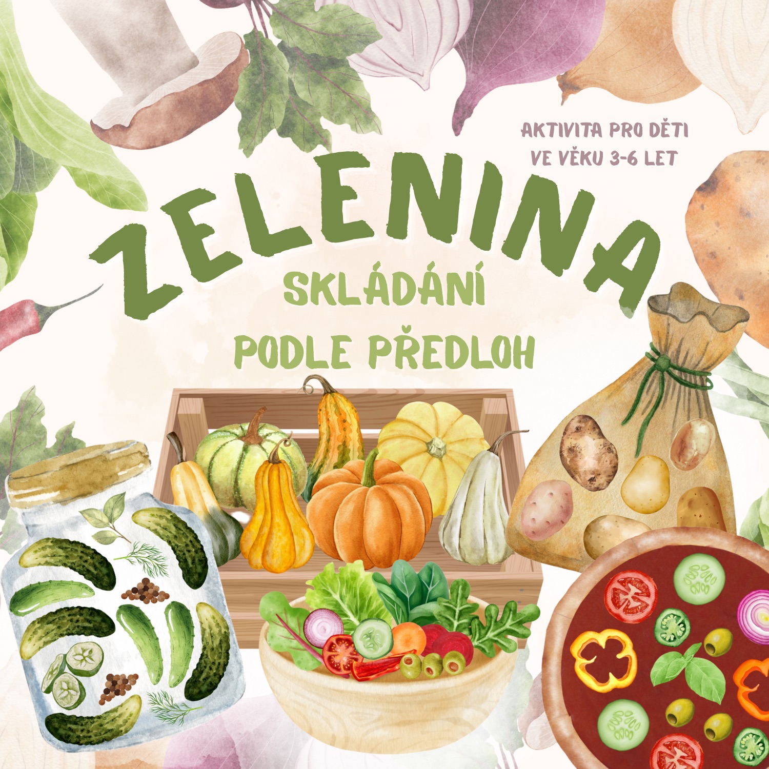 Soubor obsahuje 6 aktivit se zaměřením na skládání podle předloh s tematikou zeleniny (nakládané okurky, zelenina v řádku, zeleninový salát, bedýnky s dýněmi, pytel brambor, zeleninová pizza).
