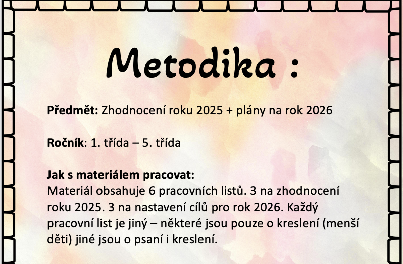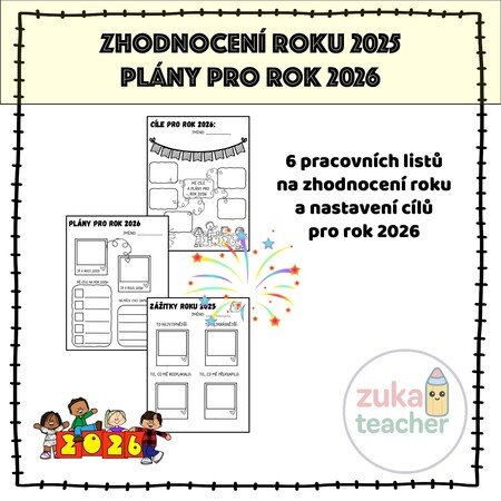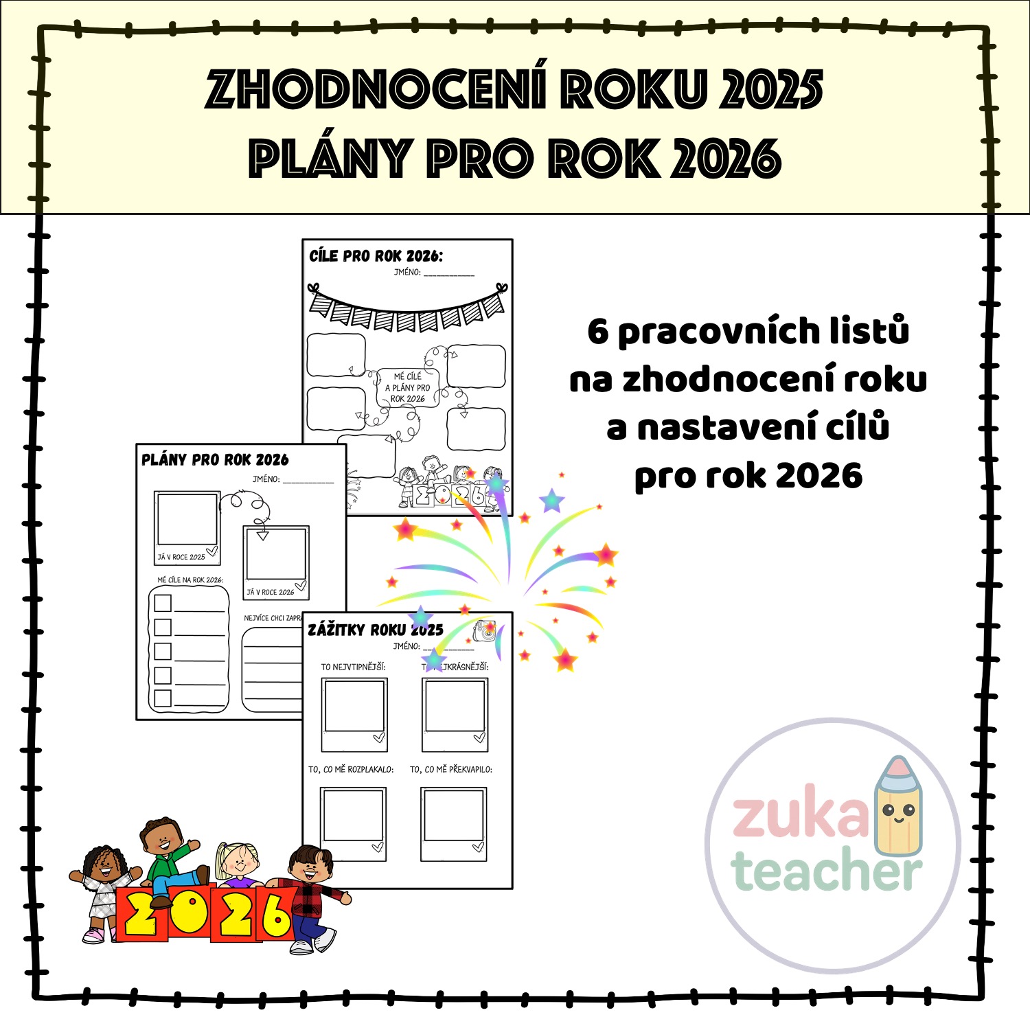 Materiál obsahuje 6 pracovních listů. 3 na zhodnocení roku 2025. 3 na nastavení cílů pro rok 2026. Každý pracovní list je jiný – některé jsou pouze o kreslení (menší děti) jiné jsou o psaní i kreslení.