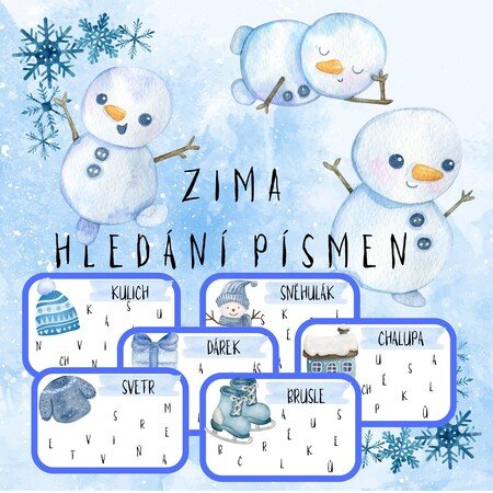 Hledání písmen tematicky zaměřené kartičky. Na každé kartičce je v horní části napsáno slovo s obrázkem. Děti mají za úkol najít a zakroužkovat všechna písmena, která ve slově jsou, mezi písmenky na levé části kartičky. K označování písmen využijte mazatelné fixy.