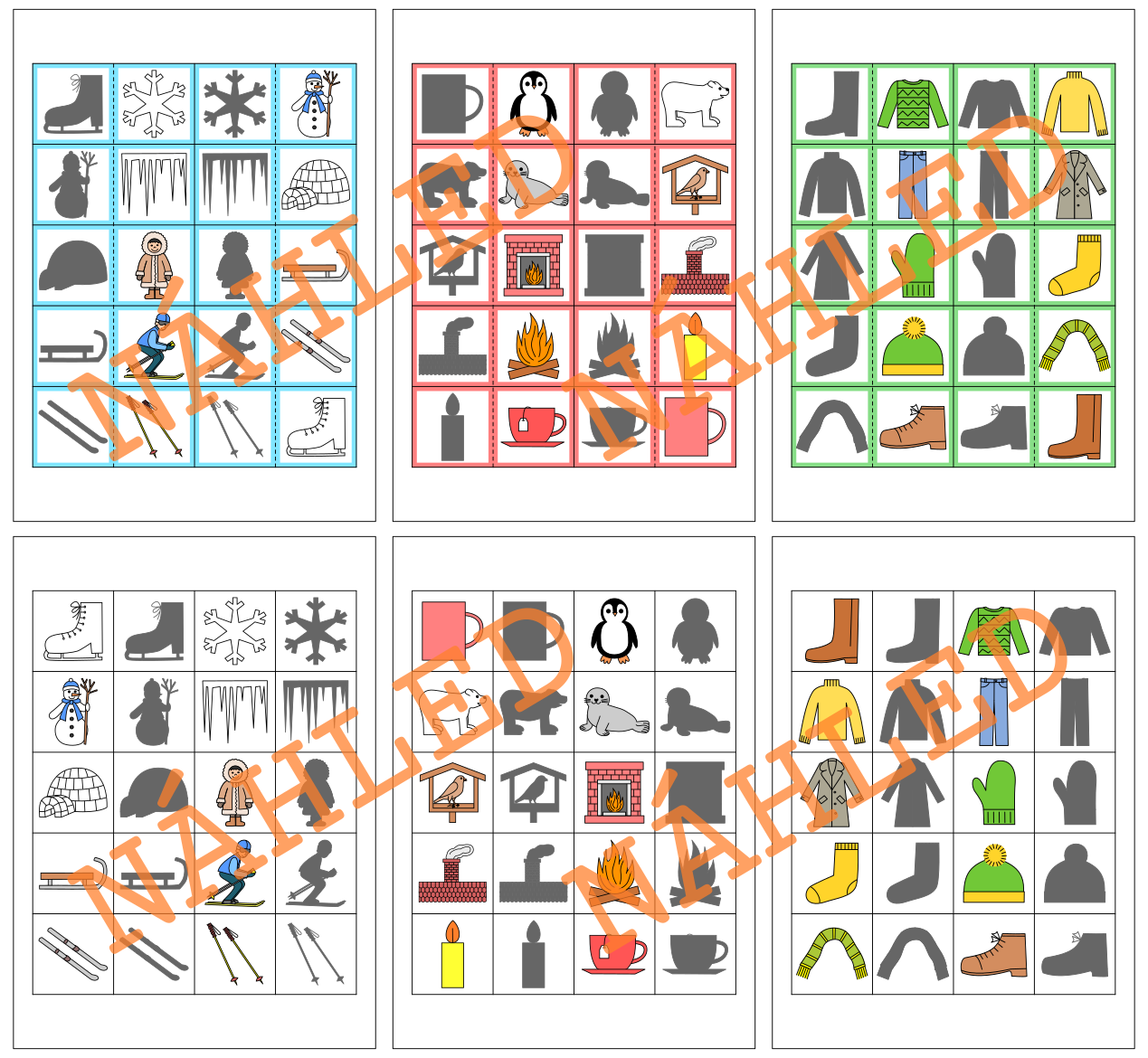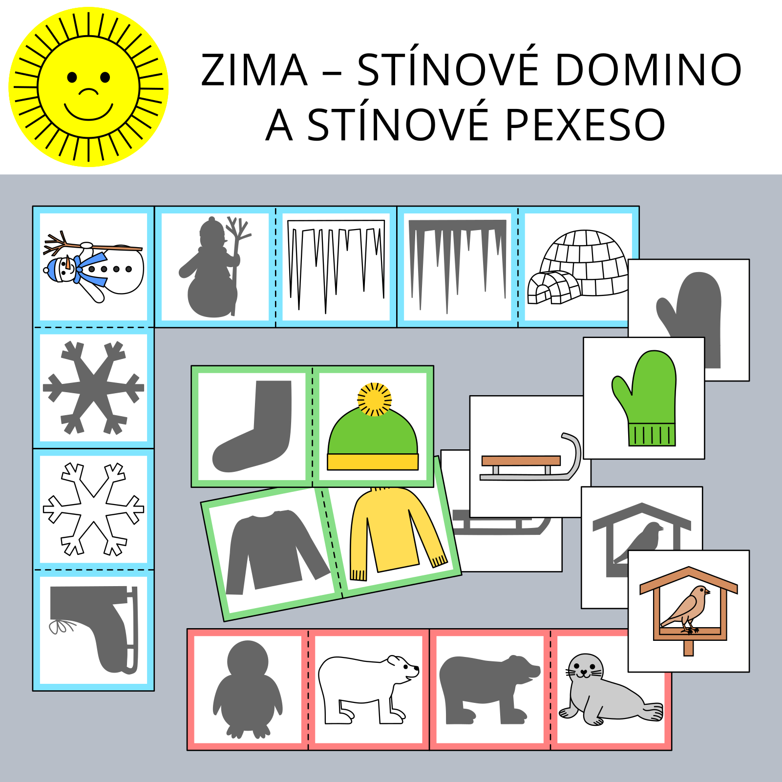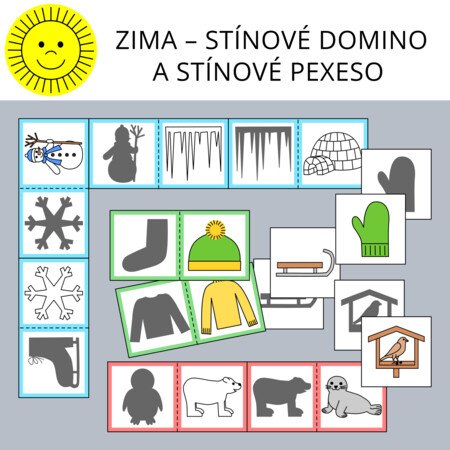 Materiál obsahuje tři strany s kartičkami domina (1 strana = 1 sada kartiček domina = 10 kartiček) a tři strany s kartičkami pexesa (30 dvojic). Tématem je zima.