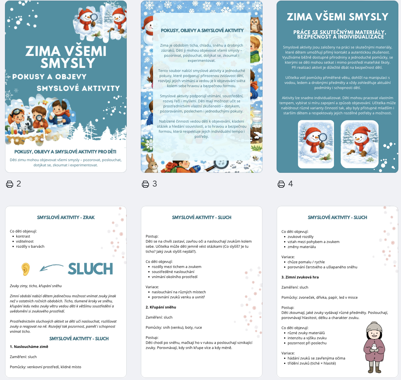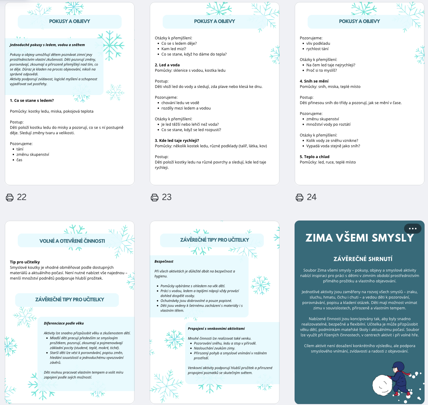 Tento soubor nabízí inspiraci pro práci s dětmi v zimním období tak, aby mohly zimu vidět, slyšet, cítit, dotýkat se jí a zkoumat ji vlastní zkušeností.