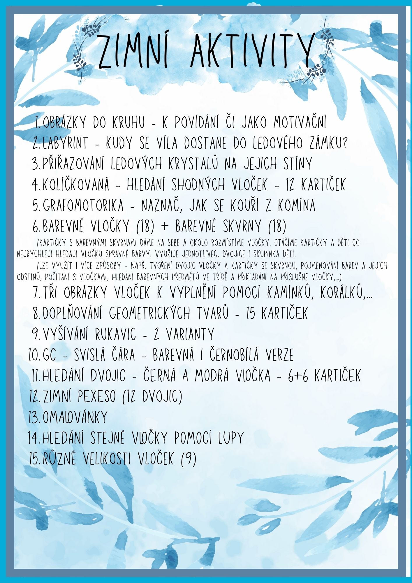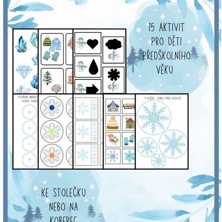 Materiál obsahuje 15 aktivit, které jsou zaměřeny na ZIMNÍ OBDOBÍ. Děti se tak zábavnou formou vzdělávají v důležitých oblastech pro správný vývoj v předškolním věku.