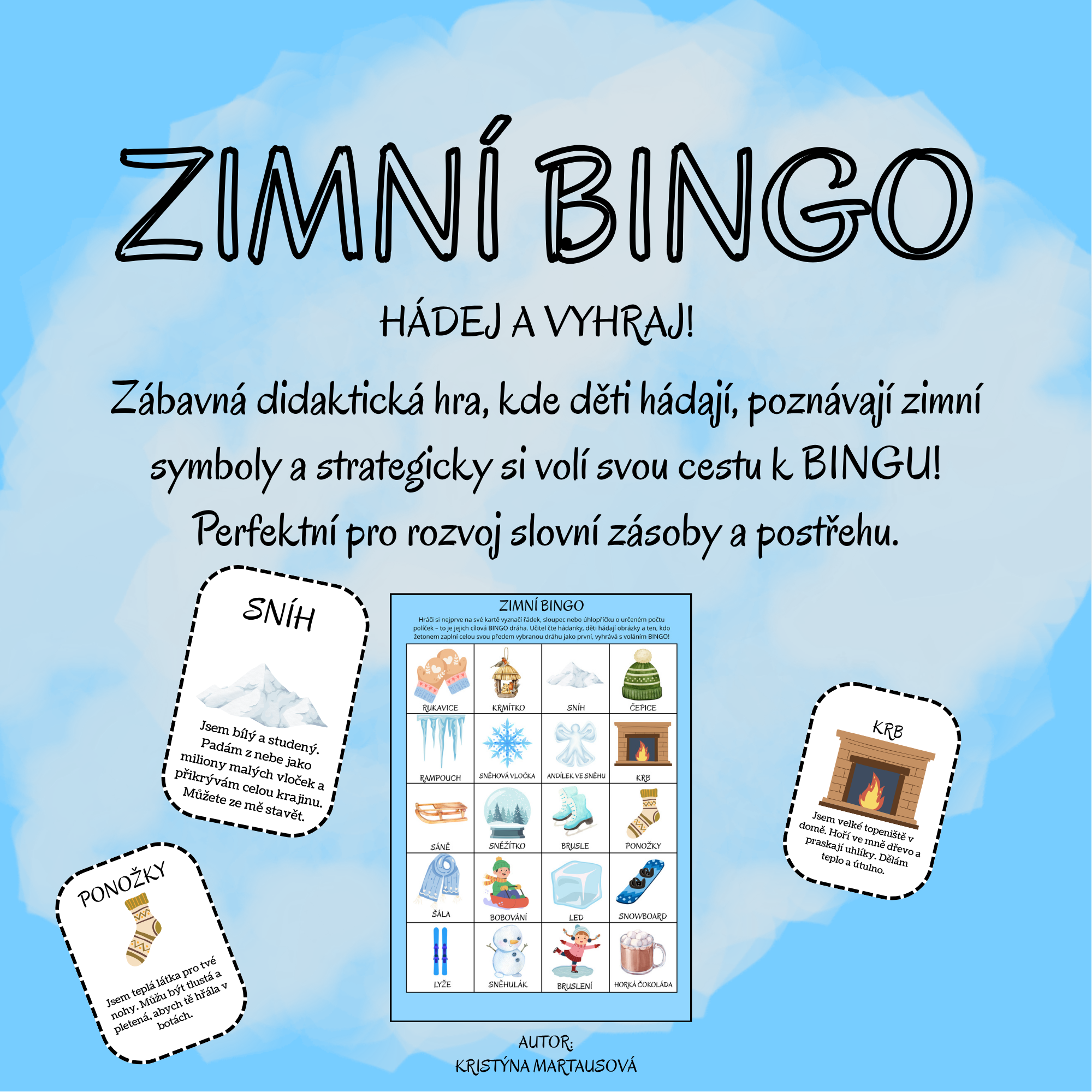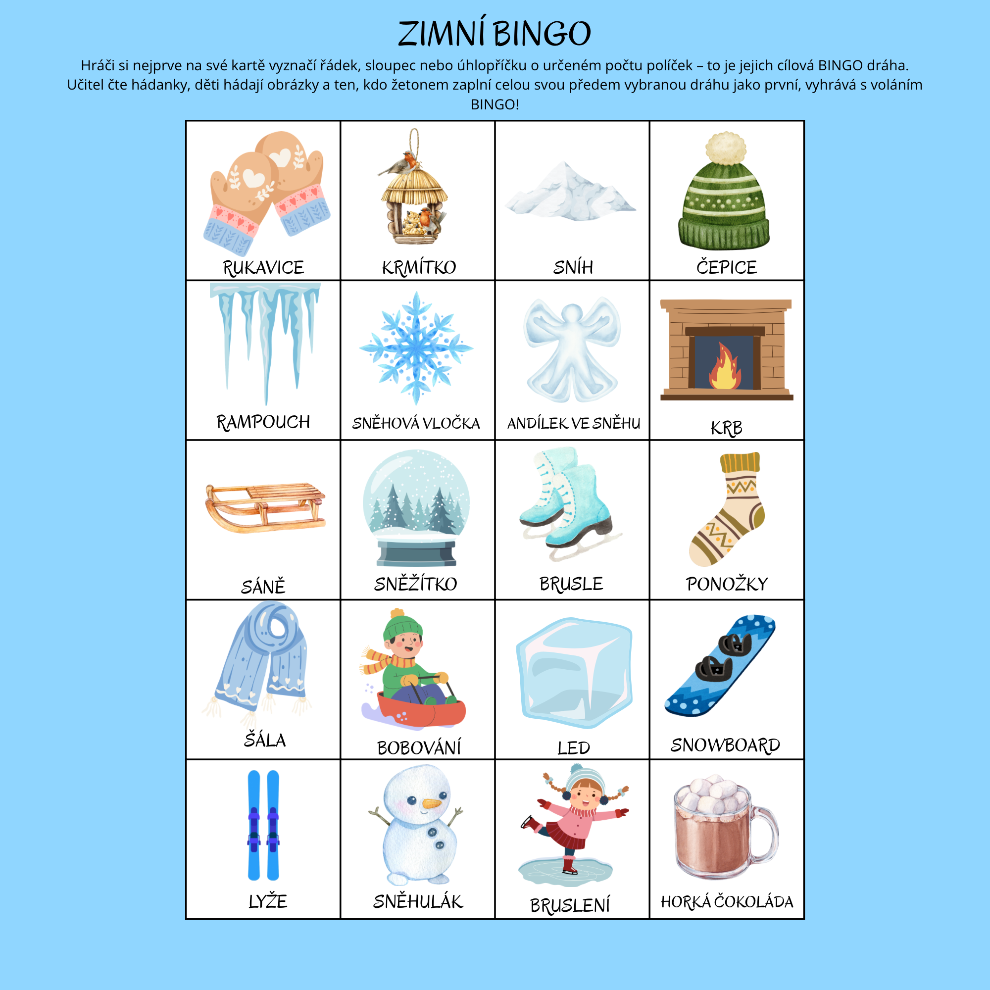 - Hlavní BINGO karta s 20 zimními pojmy (Sníh, Rampouch, Krb, Rukavice, Lyže...).