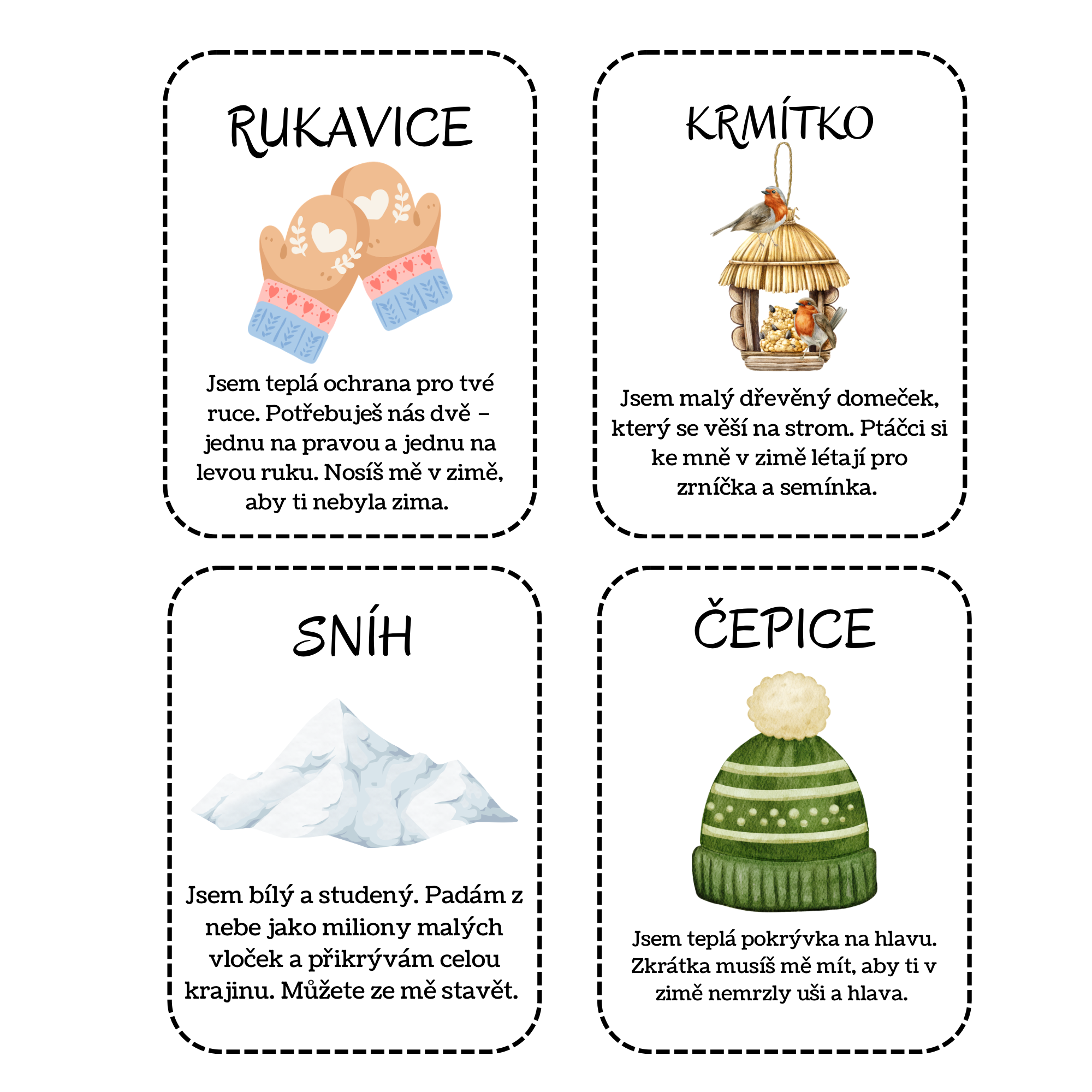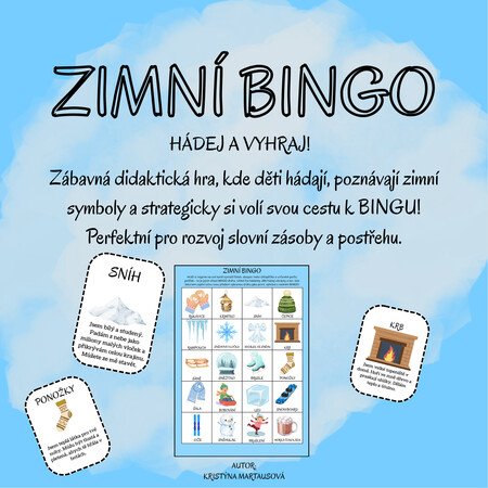- Zábava a vzdělávání: Hra kombinuje hádanky (Jsem teplá látka pro tvé nohy...) a vizuální bingo s ikonickými zimními předměty.