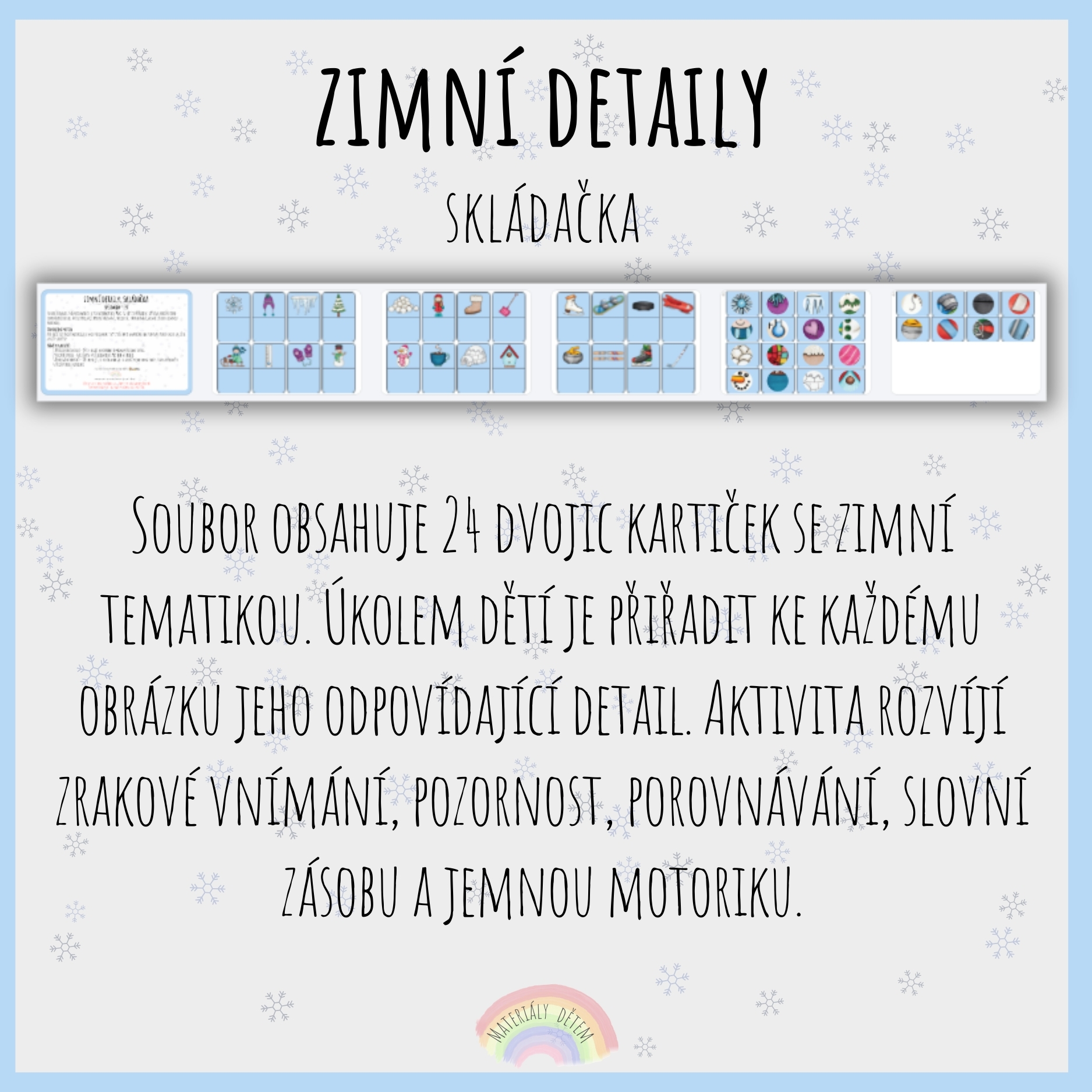 Soubor obsahuje 24 dvojic kartiček se zimní tematikou. Úkolem dětí je přiřadit ke každému obrázku jeho odpovídající detail. Aktivita rozvíjí zrakové vnímání, pozornost, porovnávání, slovní zásobu a jemnou motoriku.