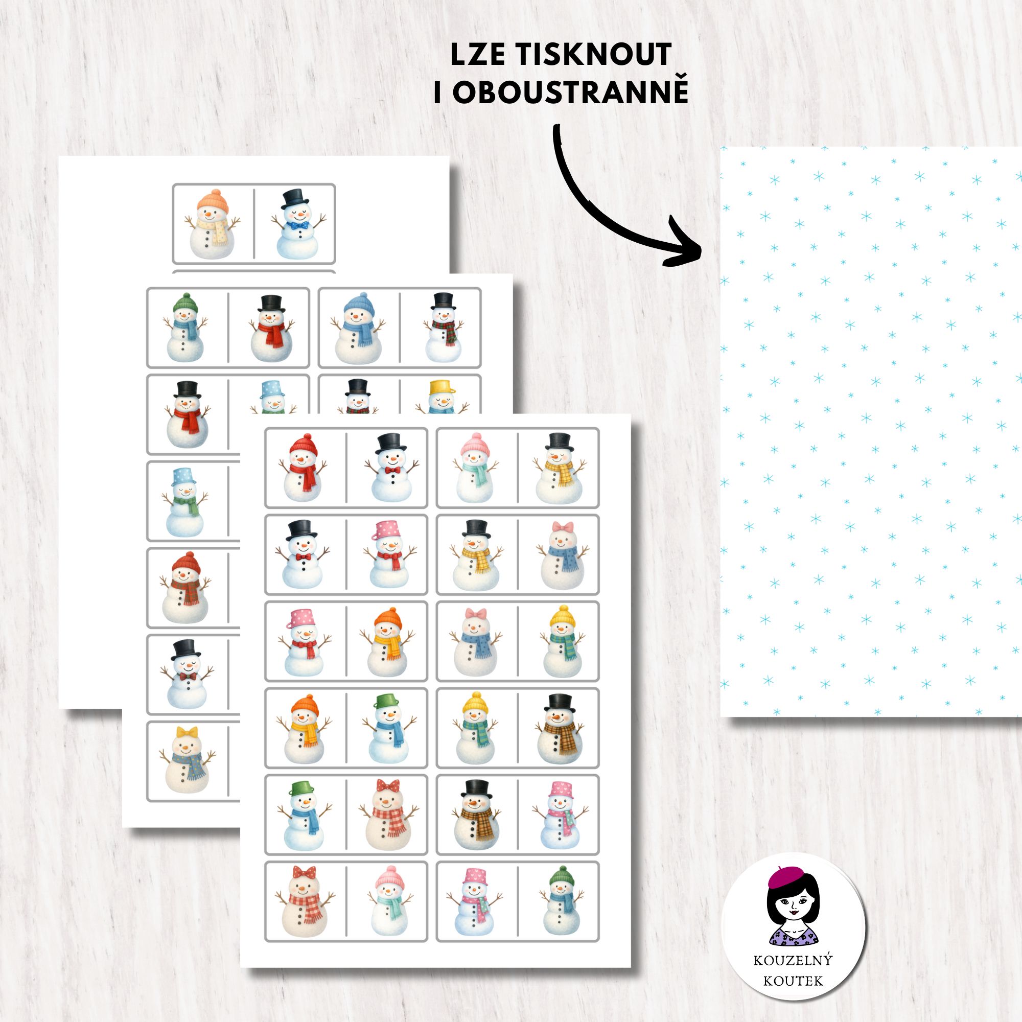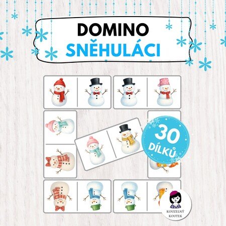 Domino je veselá a barevná hra. Obsahuje 30 barevných kartiček s veselými sněhuláky