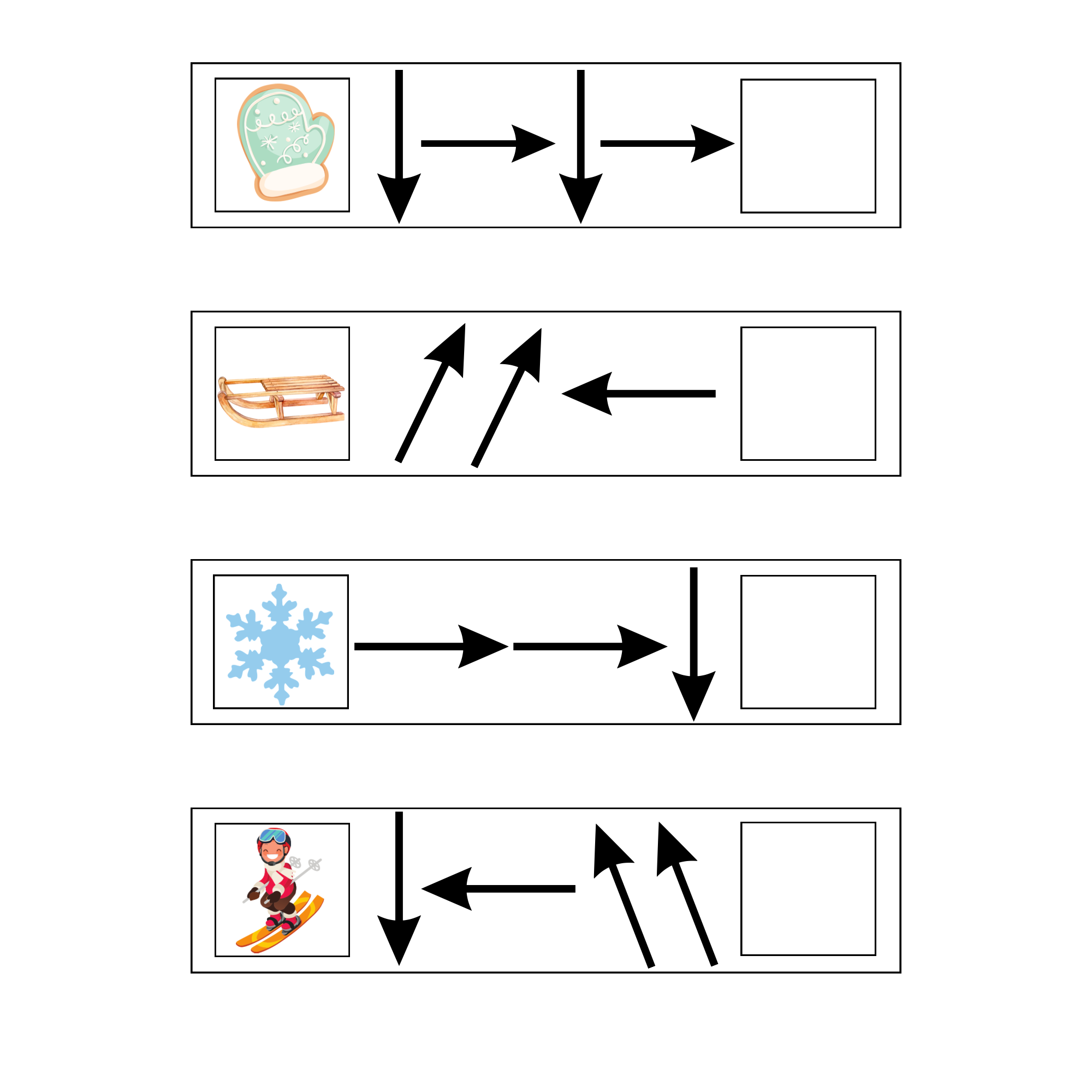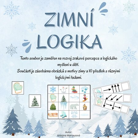 Materiál obsahuje zásobárnu zimních obrázků v přehledné mřížce a 10 předloh s různými logickými úlohami. Děti začínají na startovním obrázku a na základě sekvence směrových šipek se pohybují po tabulce. Jejich cílem je najít správný obrázek, na který je šipky dovedly, a tím dokončit logickou řadu.