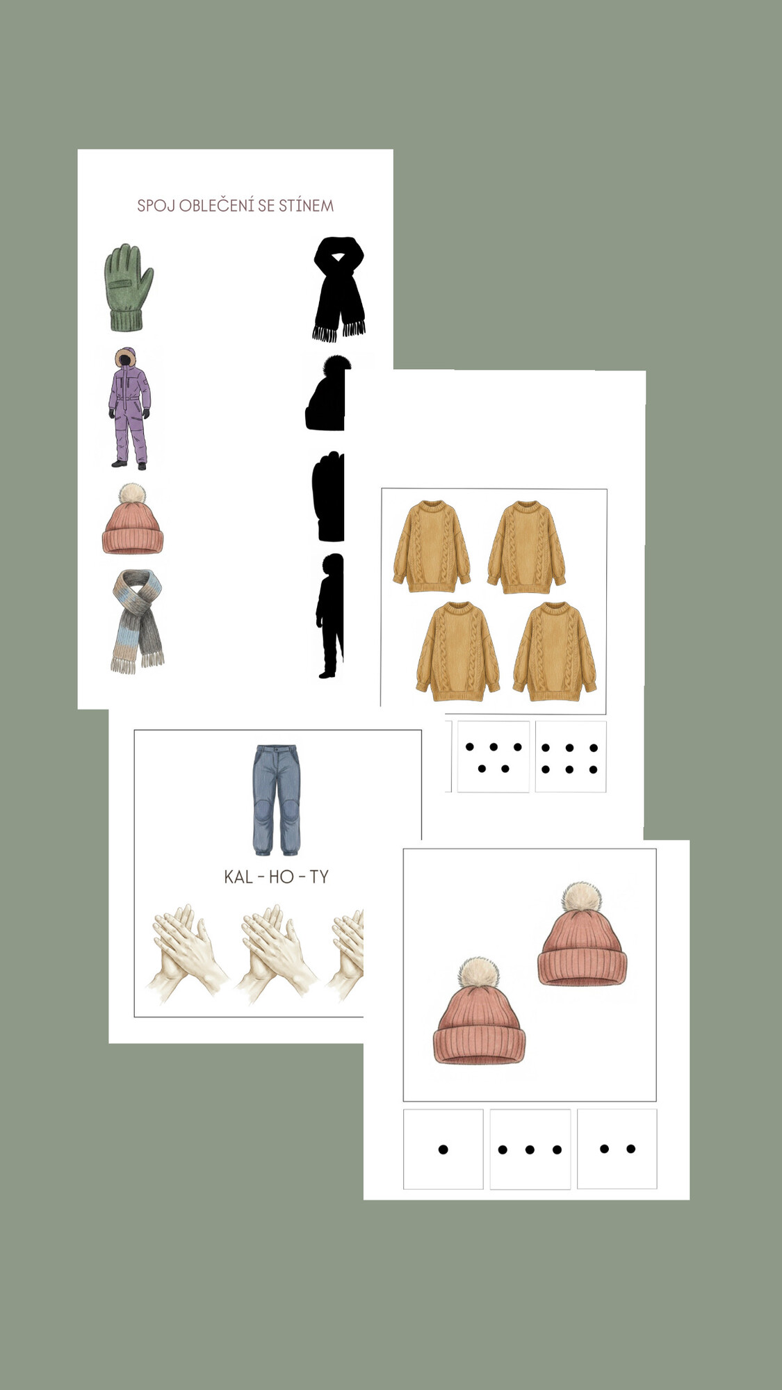 4 různé druhy aktivit do školky. Kolíčkování - pro větší i menší (7 karet od každé z variant), přiřazování stejného kusu oblečení (2 různé listy), přiřazování oblečení ke stínům (2 různé listy), karty (5) na vytleskávání slabik.