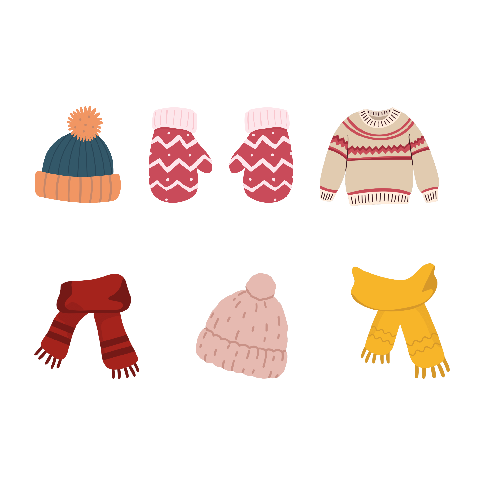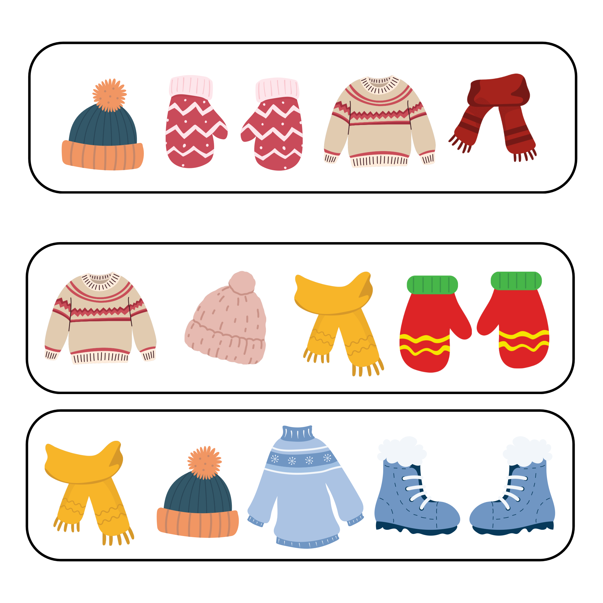 - Sada obrázků oblečení k vystřižení: Obsahuje čepice, šály, rukavice, kalhoty a boty v různých barvách.