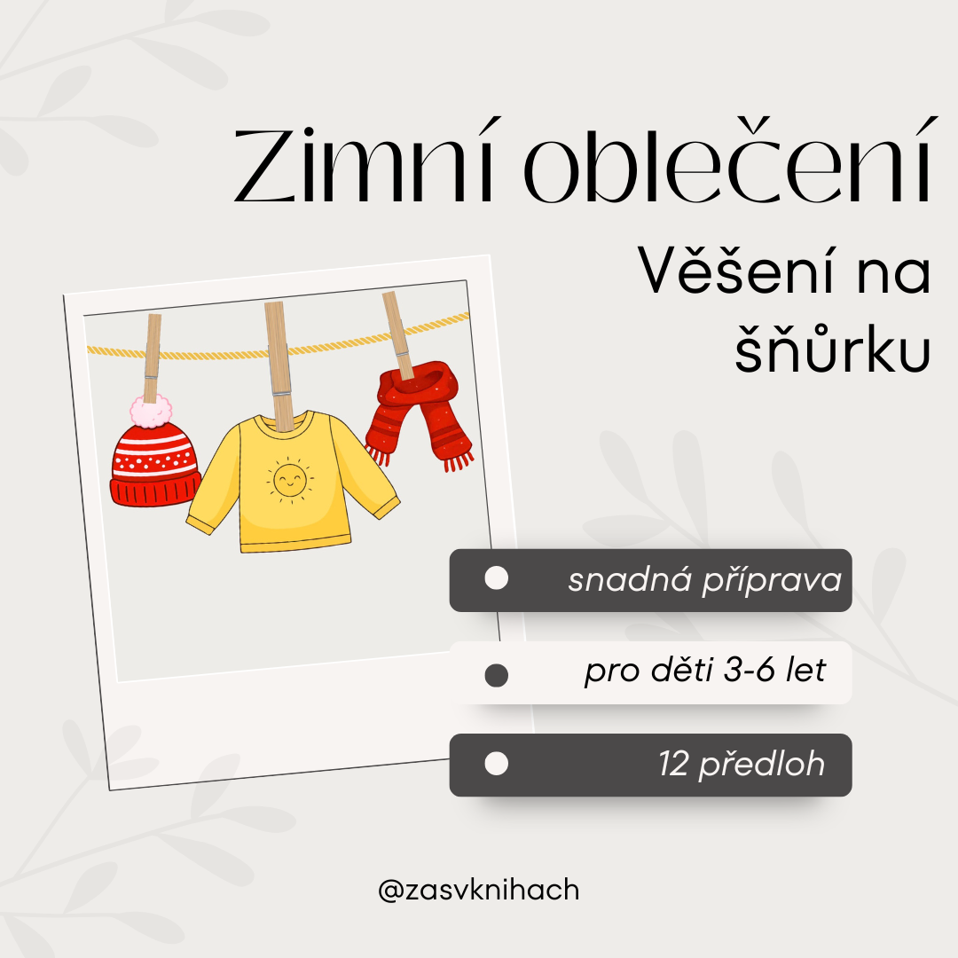 Soubor obsahuje 12 druhů zimního oblečení a 12 obrázkových karet (3 kusy oblečení na jedné) sloužících jako předloha k věšení na šňůrku. Děti mohou oblečení věšet libovolně dle své fantazie, podle barev, podle části těla na kterou oblečení patří nebo právě podle obrázkových karet. S oblečením na šňůrce se dá také hrát Kimova hra (dítě pověsí oblečení na šňůrku, krátce si ho zapamatuje, potom zavře oči a dospělý některý z kusů oblečení odstraní).
