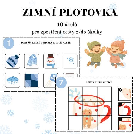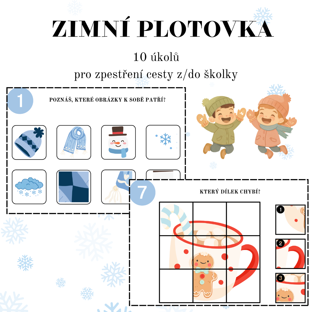 Zimní plotovka pro zpestření cesty z nebo do školky. V souboru najdete 10 zábavných úkolů. Doporučuji zalaminovat pro delší životnost materiálu.❄️