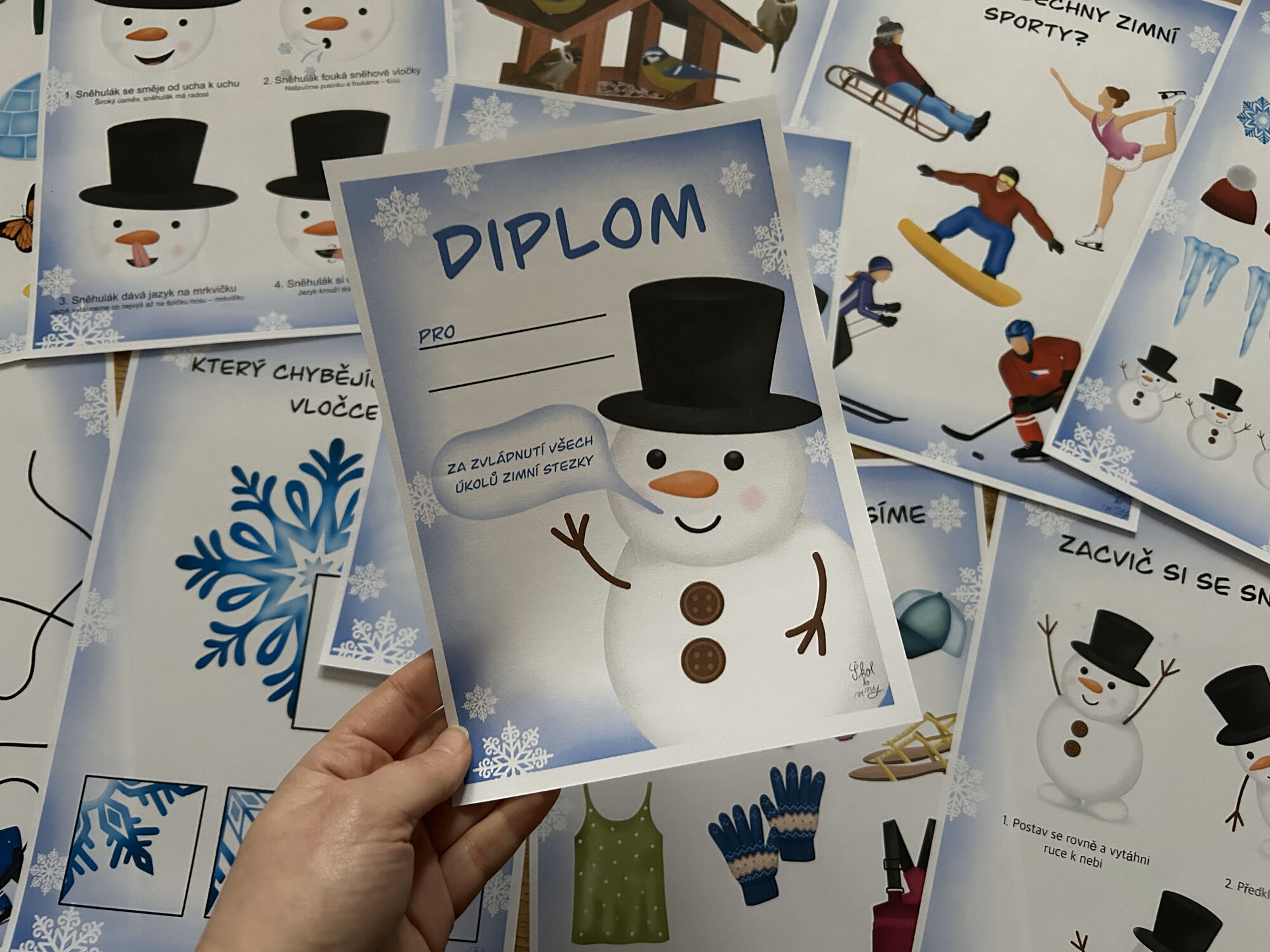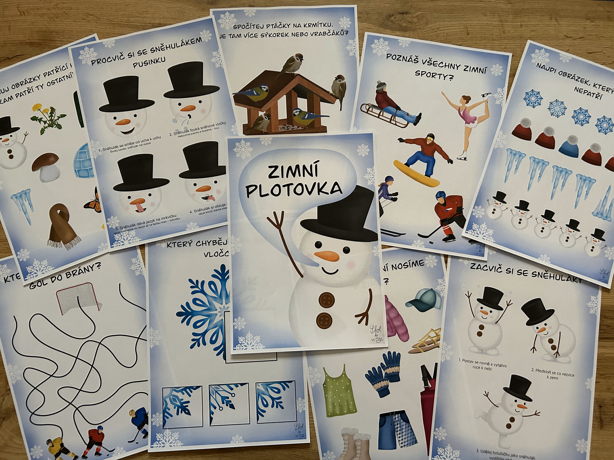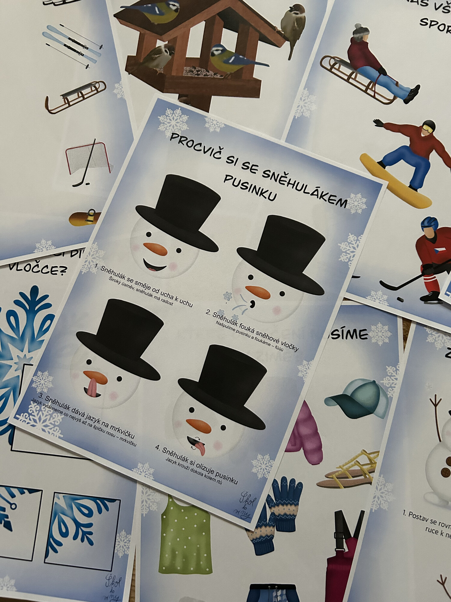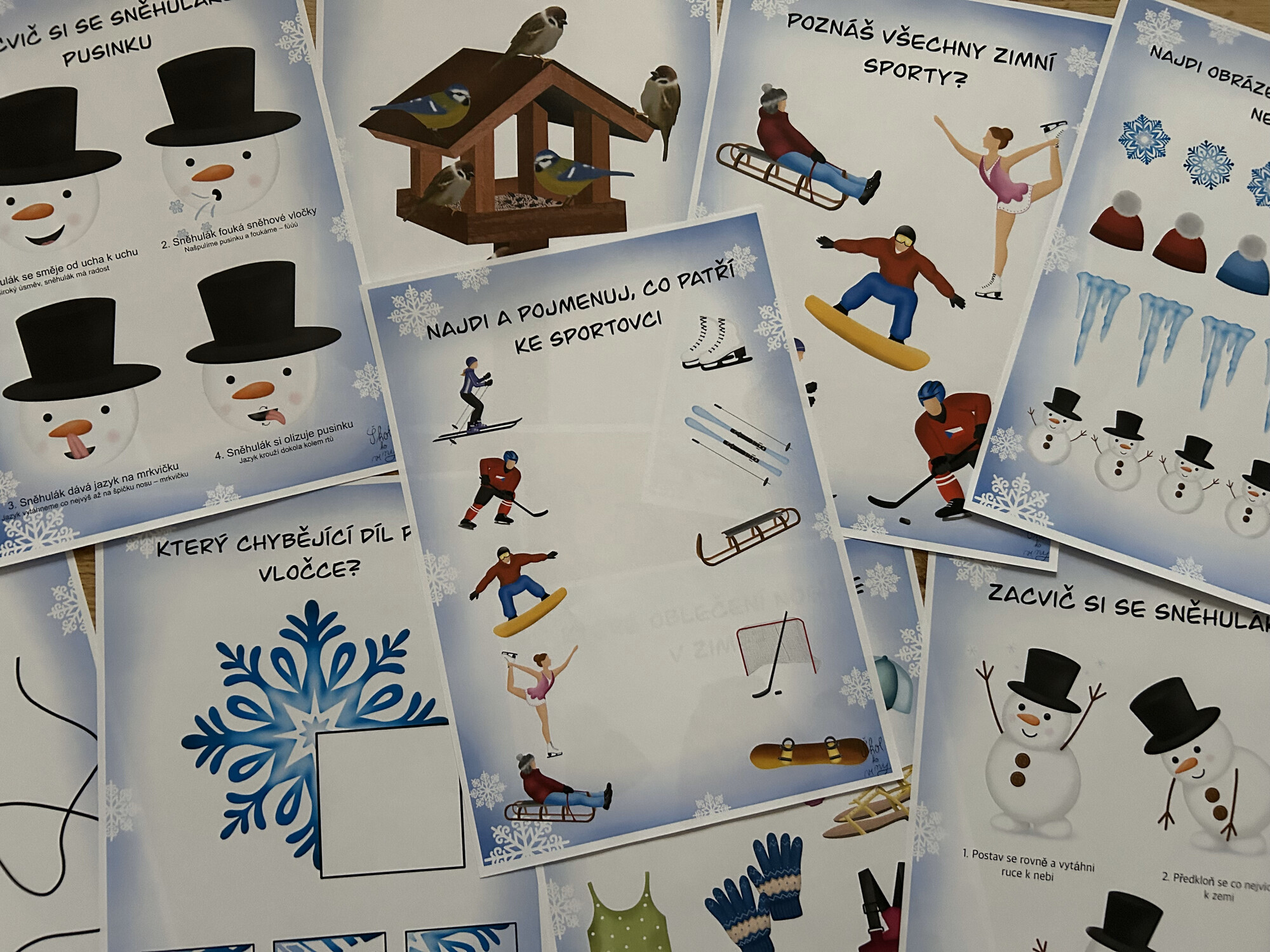 - 10 připravených úkolů k vytisknutí – hravé, tematicky laděné (např. zimní sporty, oblečení, sněhulák, ptáčci u krmítka).