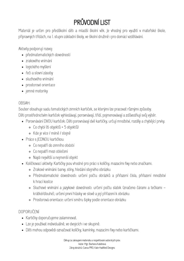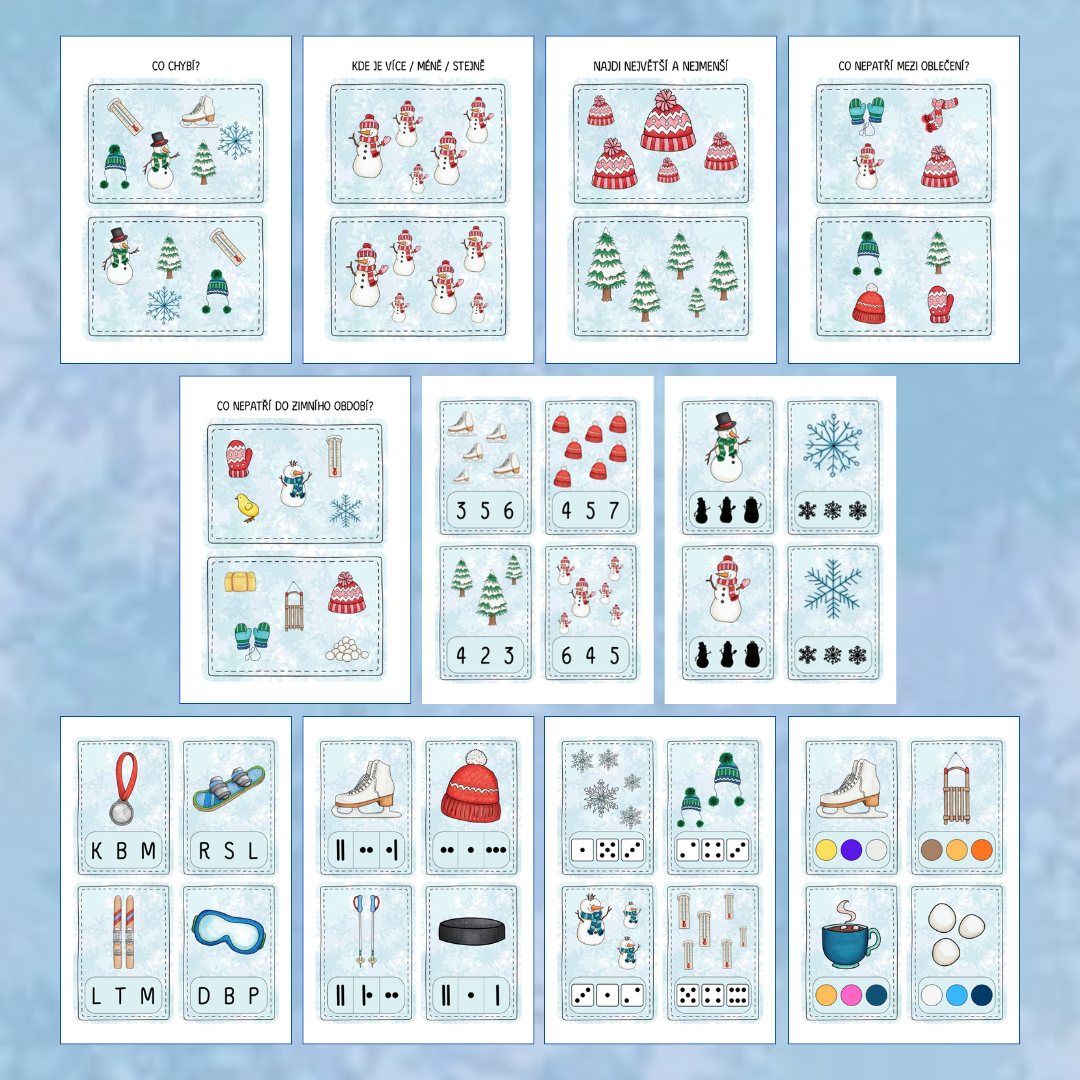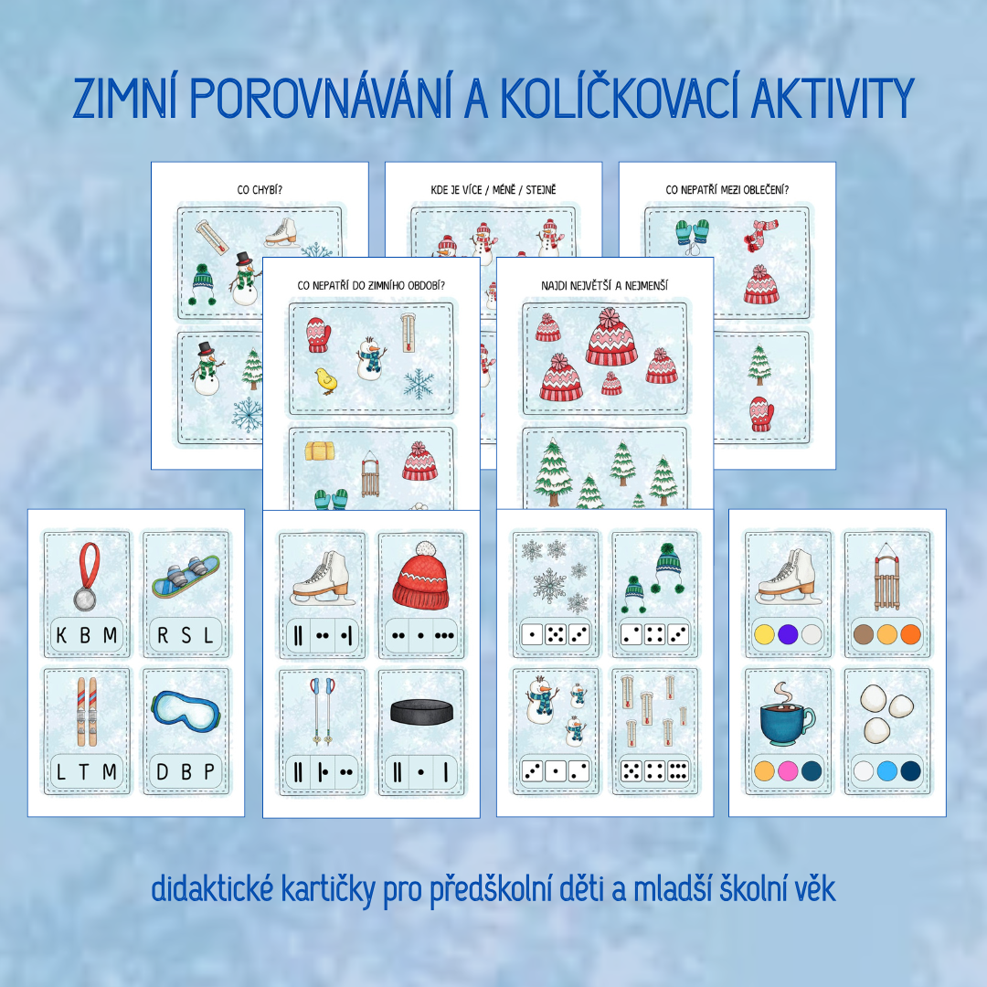 Zimní porovnávání a kolíčkovací aktivity jsou didaktickou sadou tematických kartiček, které propojují učení s hrou. Nabízejí různé úkoly zaměřené na porovnávání, třídění, zrakové i sluchové vnímání, předmatematické dovednosti a rozvoj řeči.