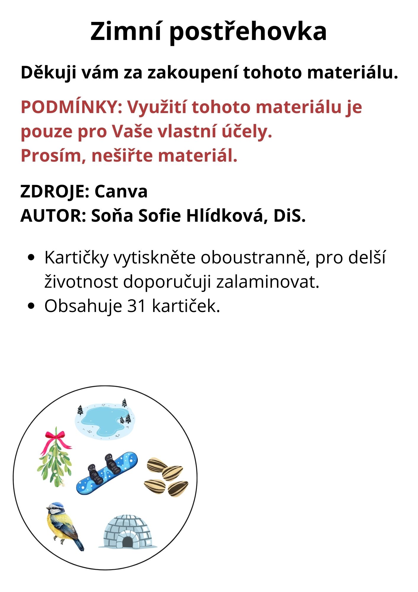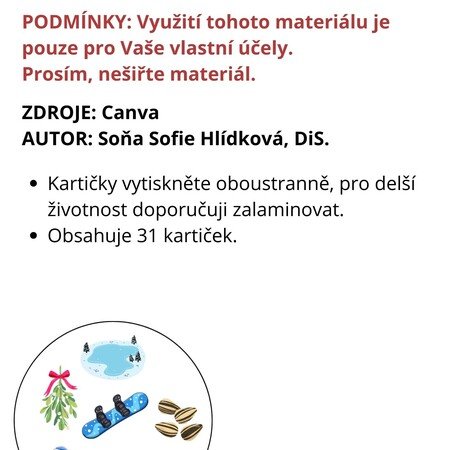 obsahuje 31 hracích kartiček na zimní téma