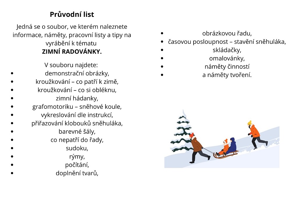 Jedná se o soubor, ve kterém naleznete informace, náměty, pracovní listy a tipy na vyrábění k tématu ZIMNÍ RADOVÁNKY.