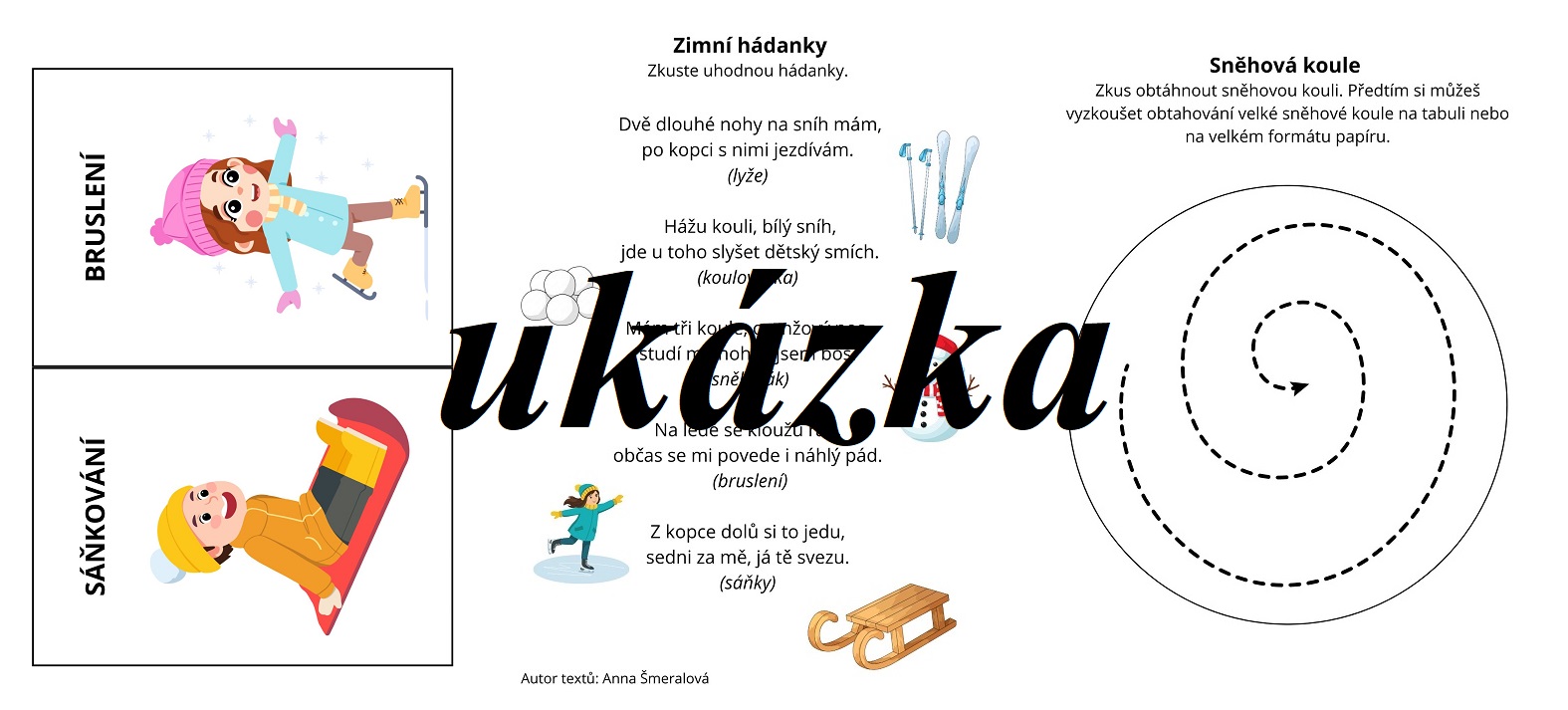 V souboru najdete: demonstrační obrázky, kroužkování – co patří k zimě, kroužkování – co si obléknu, zimní hádanky, grafomotoriku – sněhové koule, vykreslování dle instrukcí, přiřazování klobouků sněhuláka, barevné šály, co nepatří do řady, sudoku, rýmy, počítání, doplnění tvarů a další viz průvodní list.